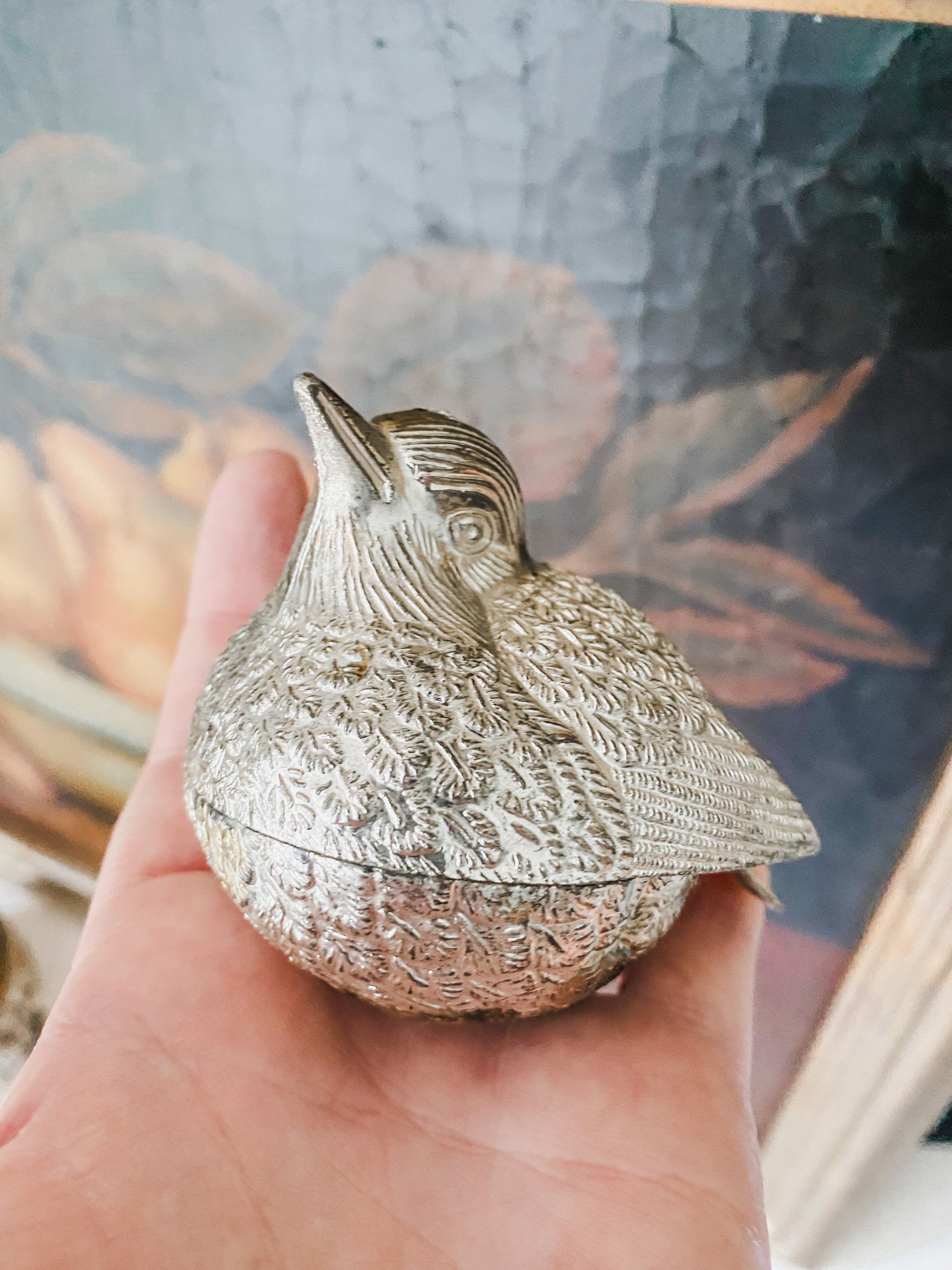 Here is a delightful duo of bird-shaped salt and pepper shakers. These charming little vintage shakers exude cuteness and feature convenient plastic stoppers at the bottom for easy refilling. While they do exhibit some signs of wear to the silver, they have tons of charm.