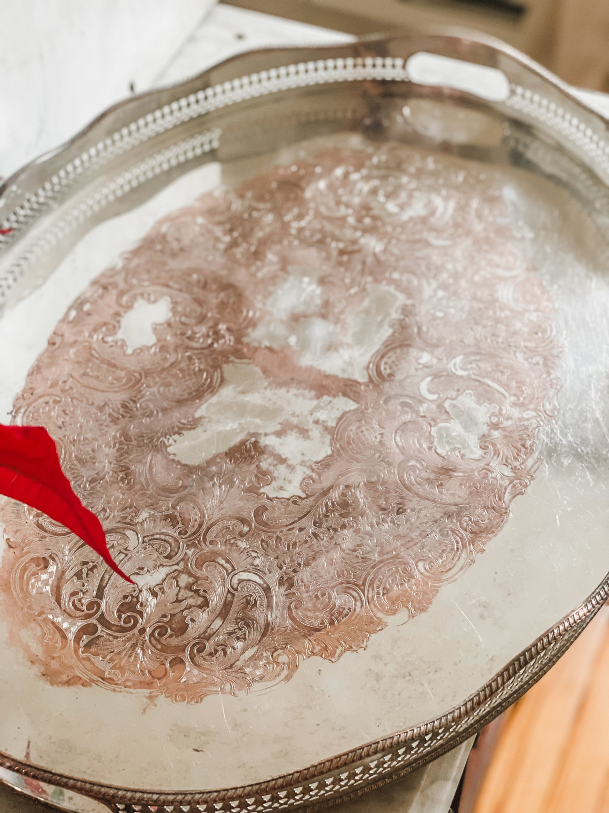 Here is a chance at a fabulous deal on a huge gallery tray made in England! Love this large and substantial sought-after gallery tray with its delicate scalloped edge and large size. There is a good amount of copper showing through the base as you can see. I have found that this does not bother me because it means it was well-loved over the years and my decorations put on the tray cover up the center anyway. 23" x 17"