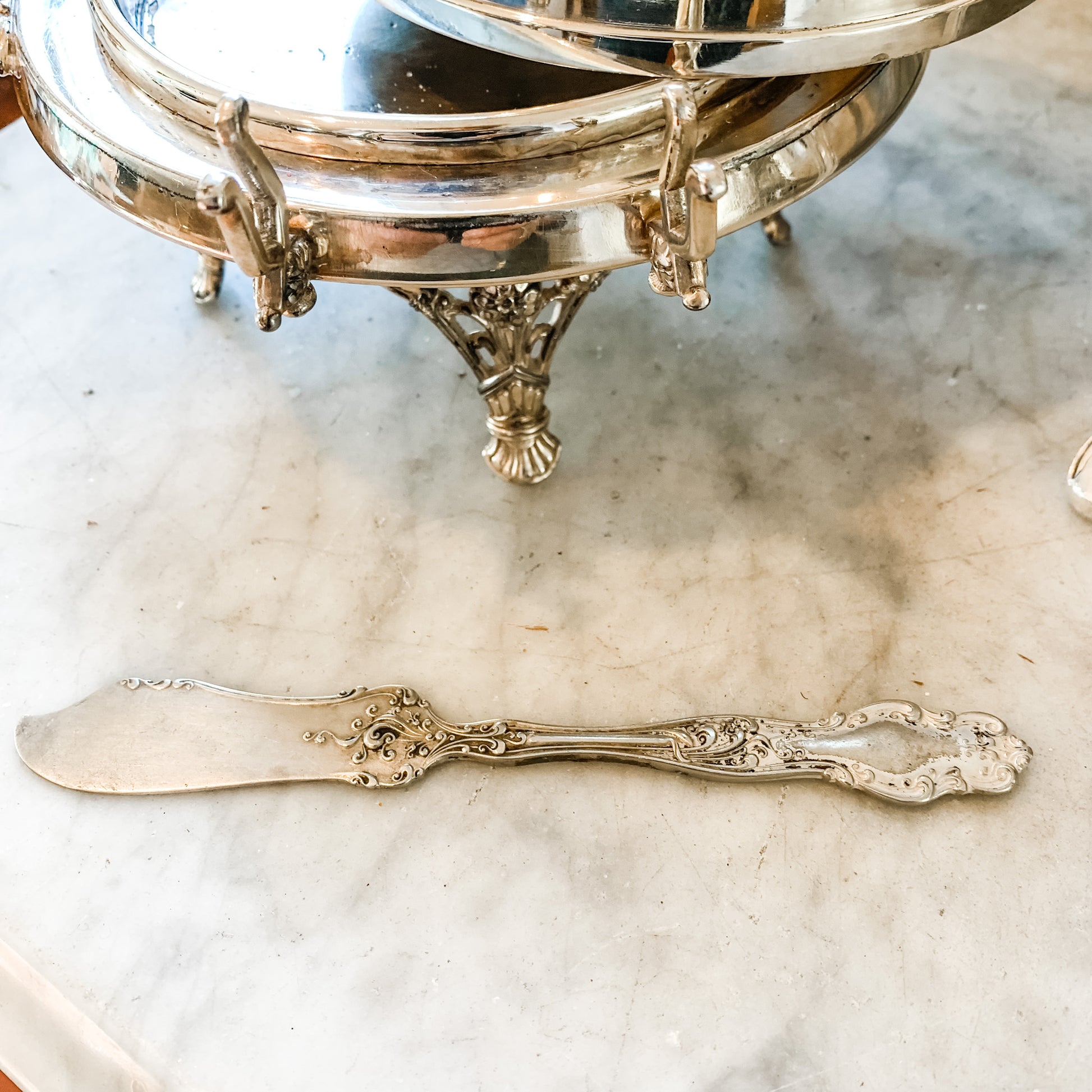 Here is a beautiful antique silver plate butter dome which was made by J. W. Tufts Silver Co in Boston.. Tufts silver company operated in the 1800's. Many pieces and original catalogues are in the Smithsonian Museum Collections. Interestingly Mr. Tufts founded the village of Pinehurst in North Carolina which now contains the renown Pinehurst Resort and golf course. This butter dome has lovely chased medallions on its highly domed lid. The original drain tray sits in the interior and the base sits on tall elaborately decorated legs. There is a holder for a butter knife on front, the ornate knife included while antique, is not original to this piece. It is in very good antique condition with a few minor tarnish areas. It stands 8.5" tall x 8 x 7.