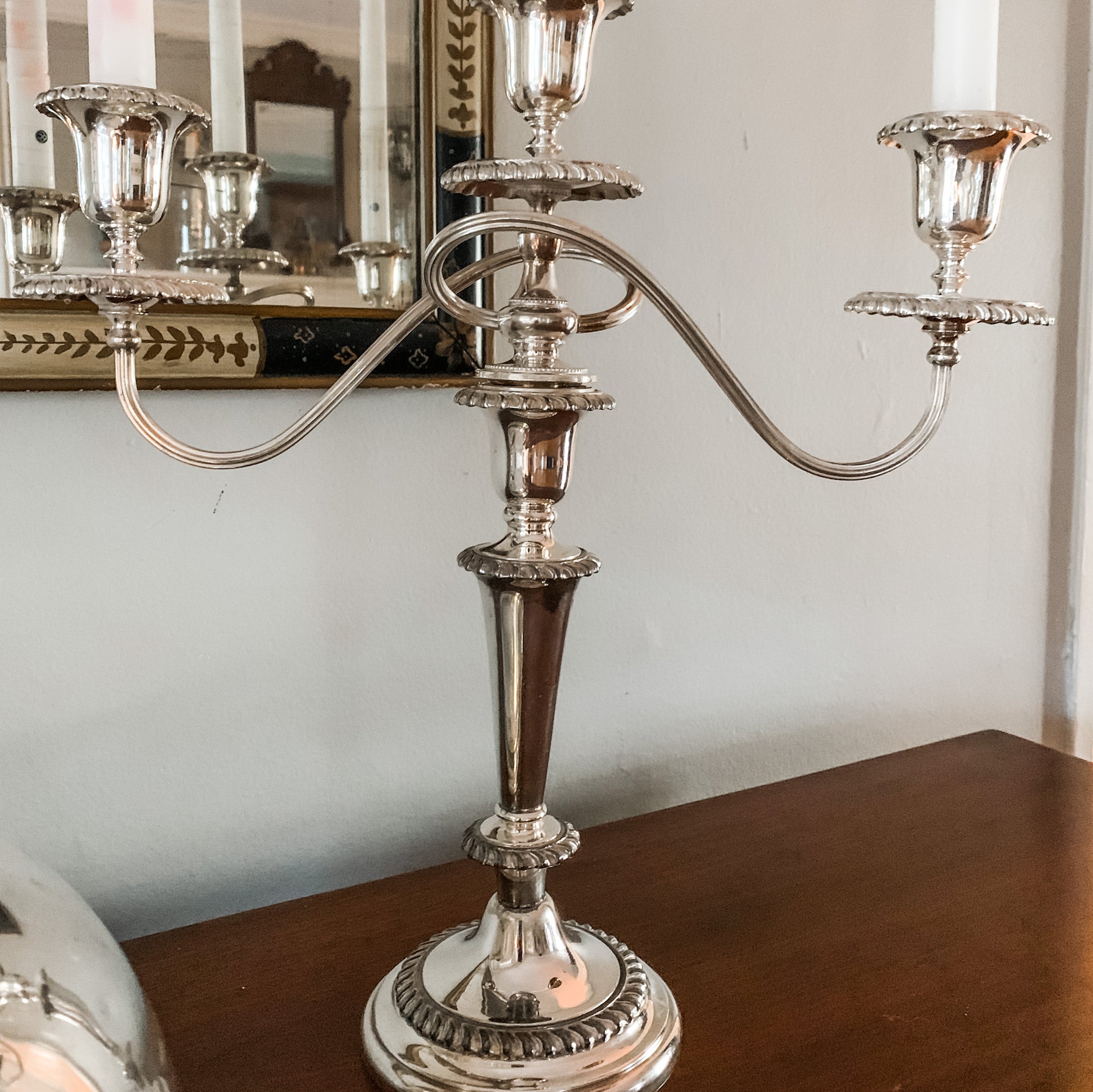Stunning graceful and classically designed, large antique silver plate candelabras! This set is one of the most beautiful I have seen. Very high quality and excellent antique condion. Each of the candle holders unscrew from the arms. The arms come off if you want to use them alone as a single tall candle holder. Outstanding quality and condition. 13.5" tall x 12" wide. *****This piece is part of the specially attained Philadelphia Main Line estate collection. These dramatic heirloom pieces are very high quality plated silver from the 1800's to early 1900's.