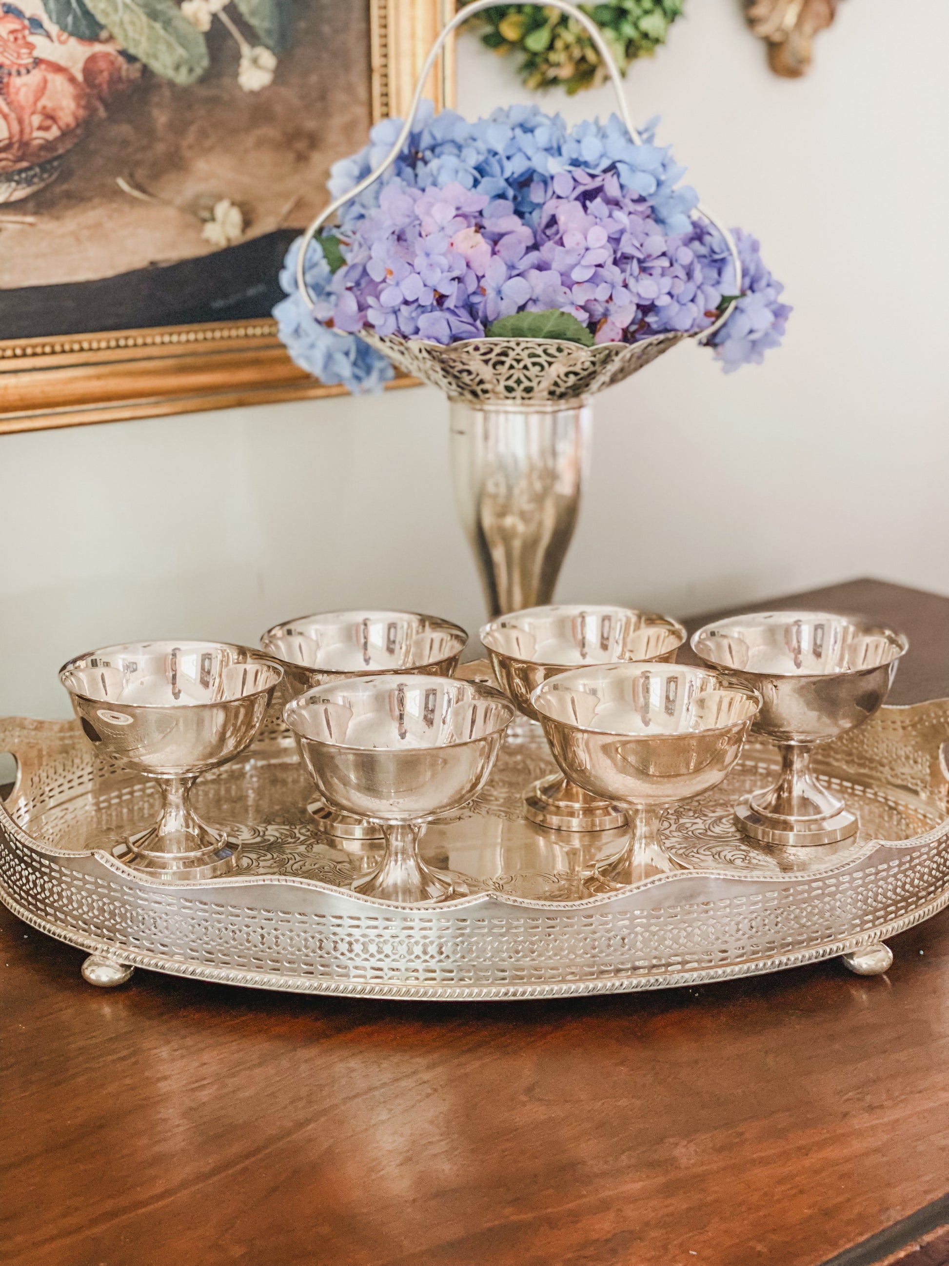 Here is a delightful set of 6 heavy vintage silverplate dessert serving cups with a delightful pedestal vase. What an elegant presentation for fruit or dessert! Each is 3.5" x 4" heavy. These have some wear from use but in otherwise wonderful vintage condition (does not include tray pictured)