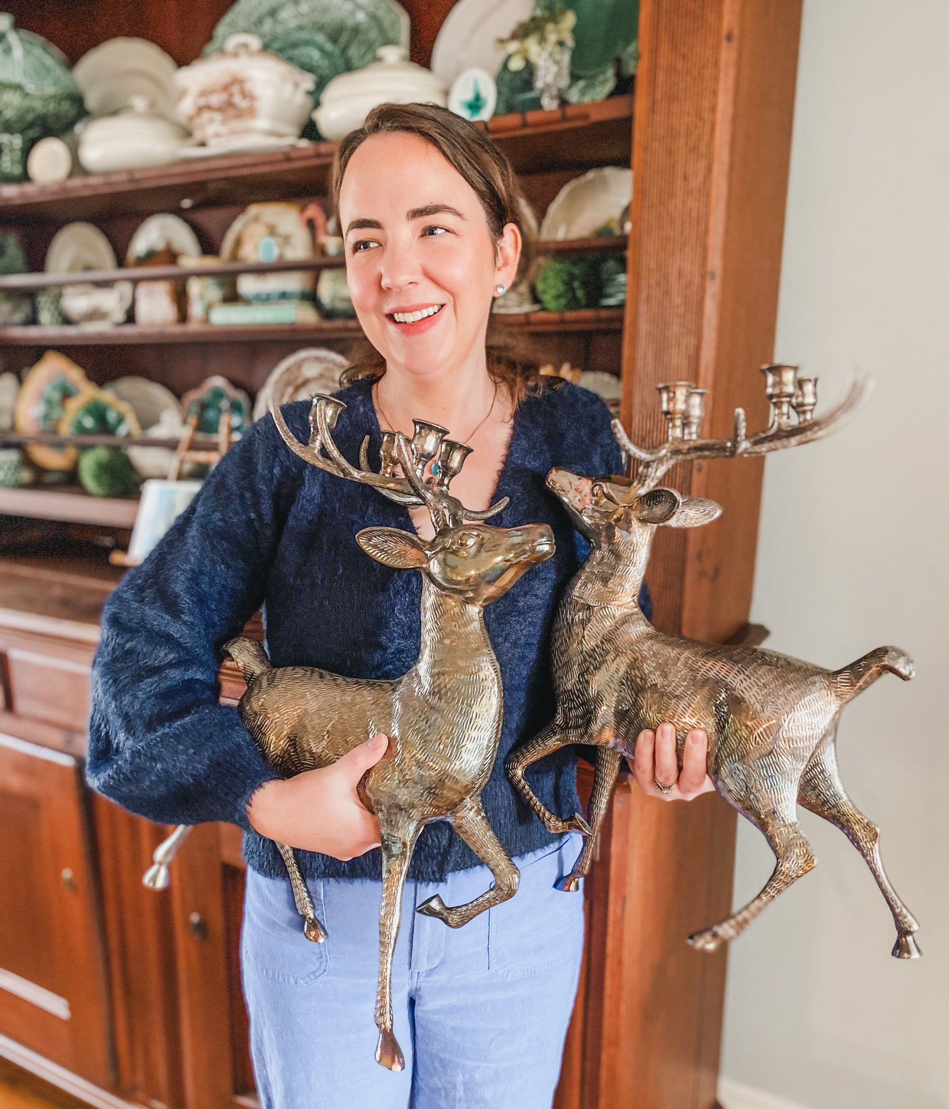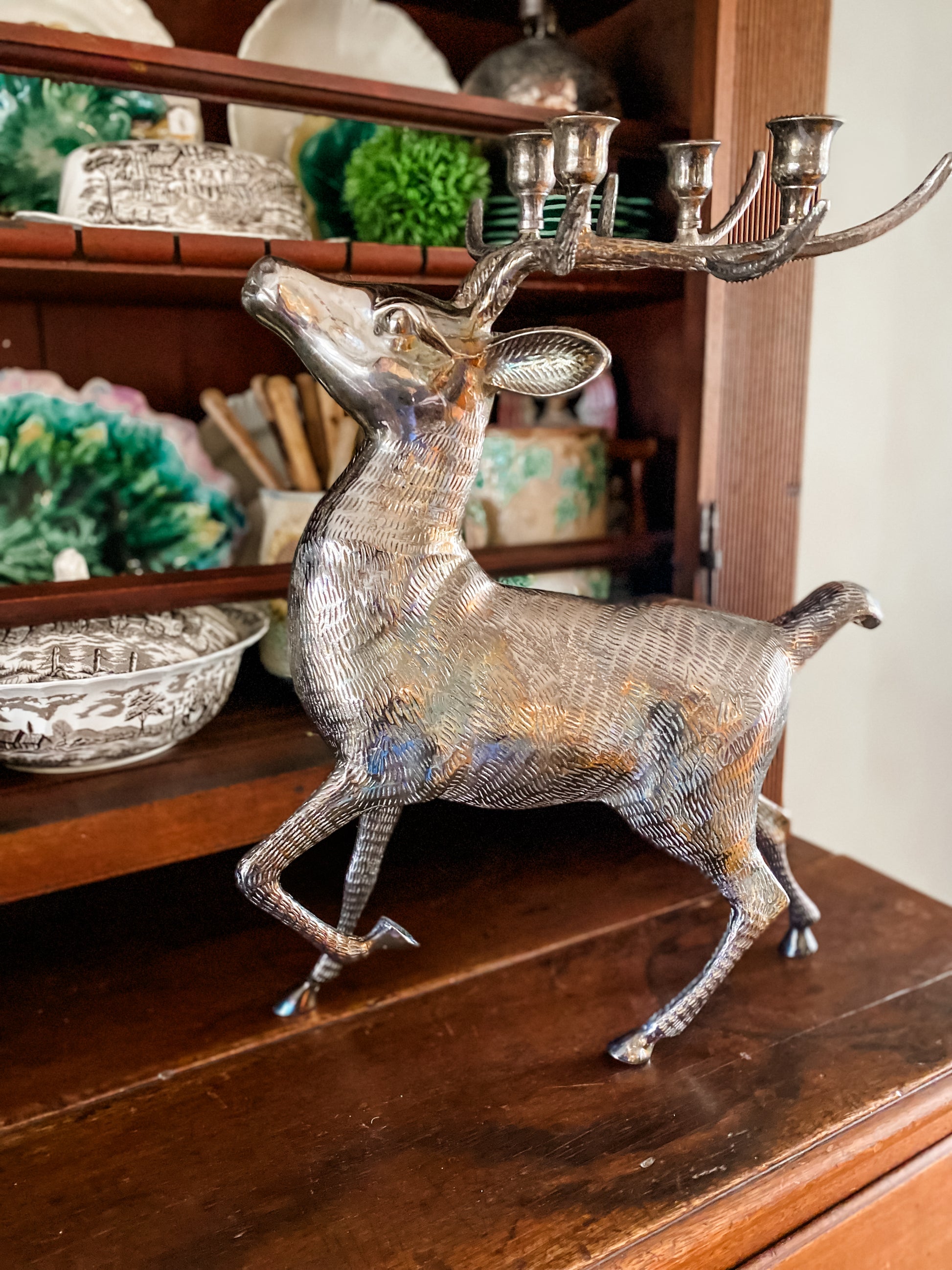 This pair of silverplated brass reindeer is truly something special. They’re beautifully cast, silverplated, and extremely heavy — the quality is on a completely different level from the lightweight, basic designs you see in stores today. The detailing on these is incredible and honestly hard to find anymore. They have that high-end craftsmanship that makes them stand out. When I was bringing them inside, I set them down on my hutch and I just love how they look! I don't want to move them!