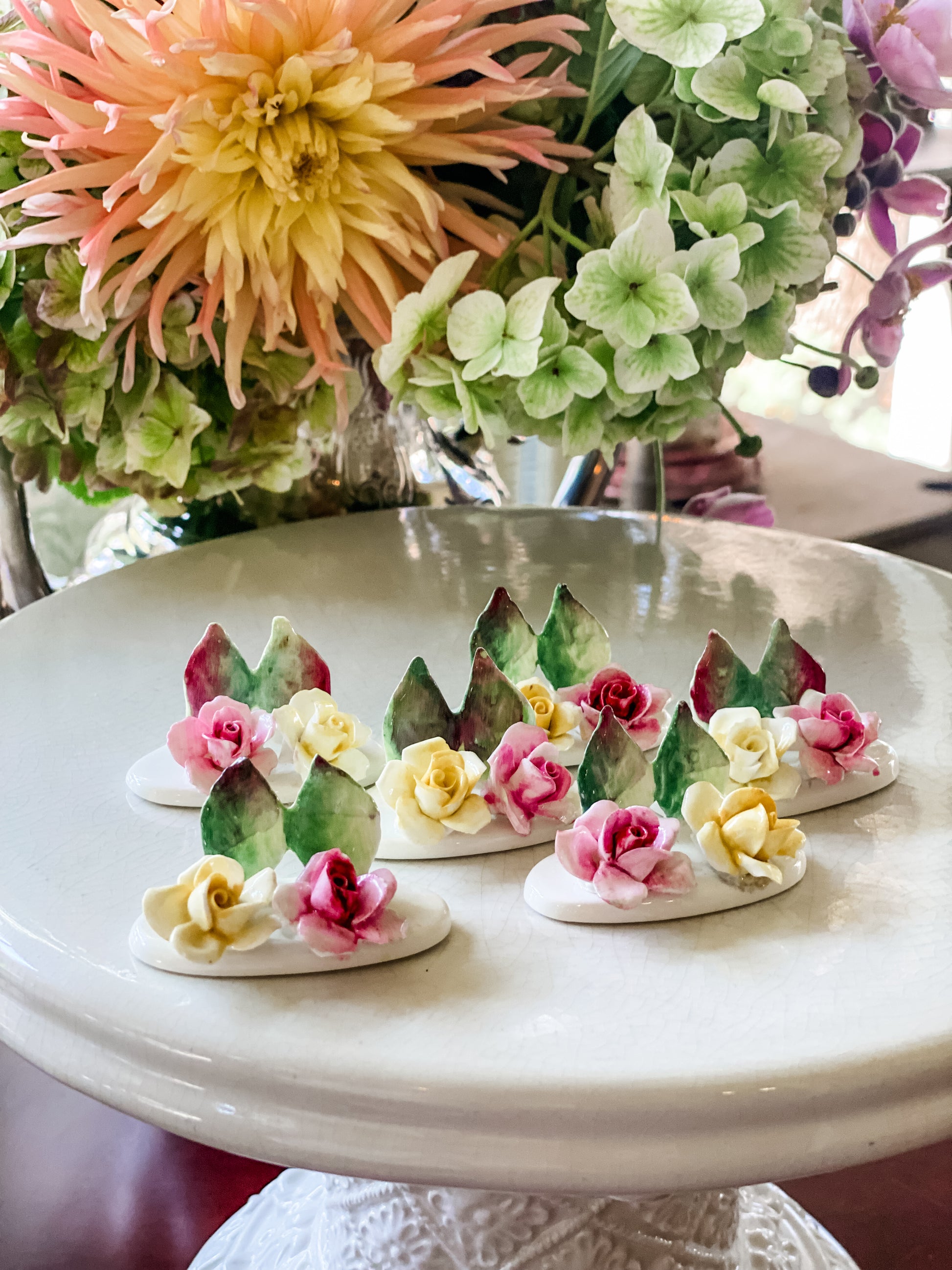 Here is a set of 6 Staffordshire rose placecard holders. Aren't they pretty!? Some of my favorite pieces to collect. I just love the delicate roses. Fine Bone China made in Staffordshire England. Excellent vintage condition.