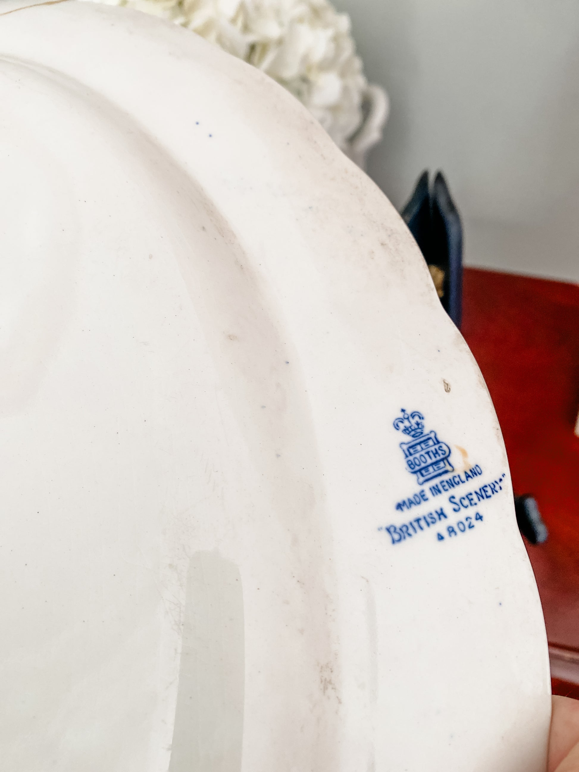 This blue and white Booths “British Scenery” platter was made in England by the respected Staffordshire pottery firm Booths, founded in 1868 and known for its refined earthenware and beautifully executed transferware. The scene at the center depicts a peaceful pastoral country home with a horseback rider and grazing animals— a glimpse of the English countryside that Booths was so well known for. The image is framed by a garland of grape leaves and wheat.