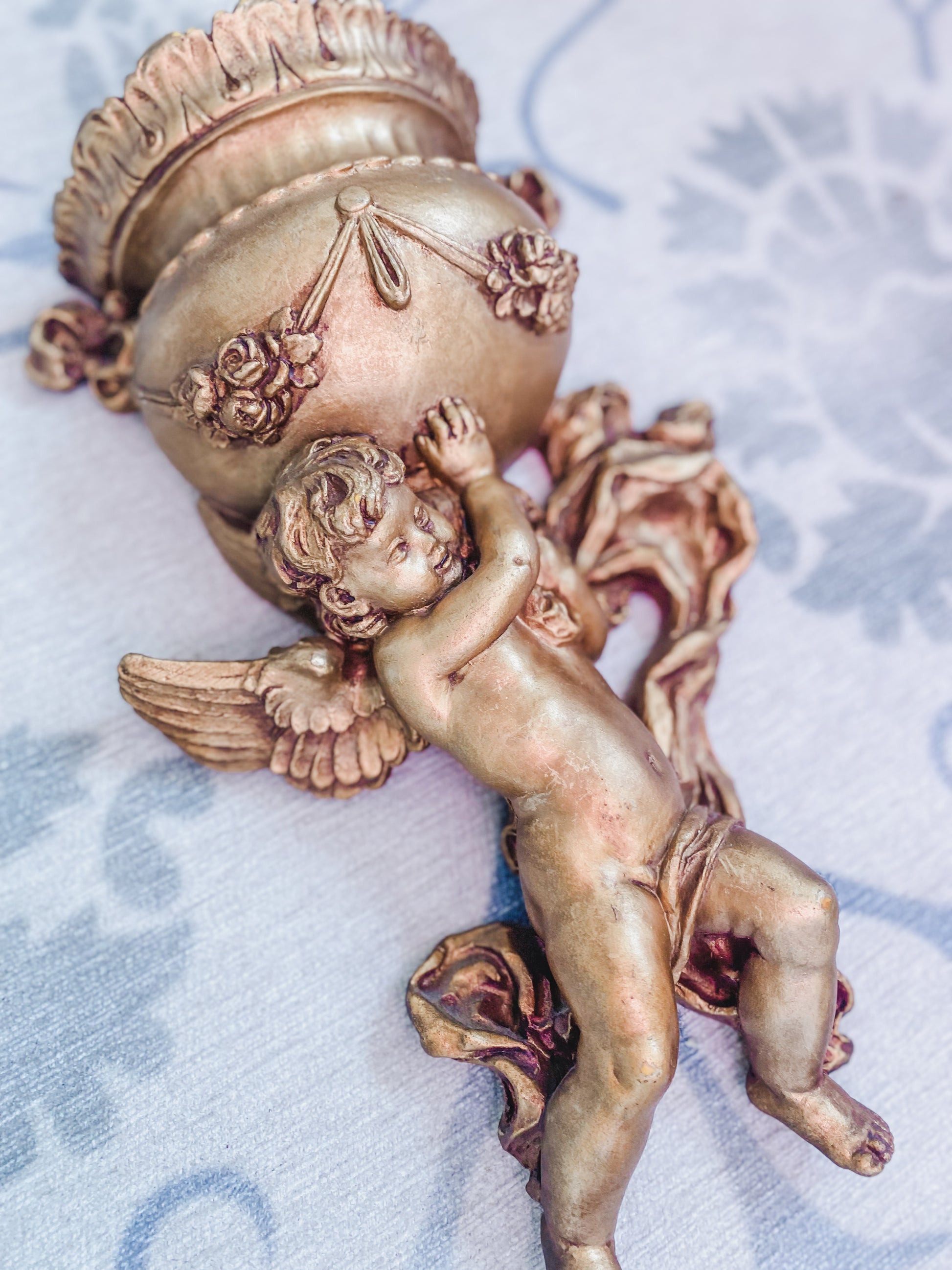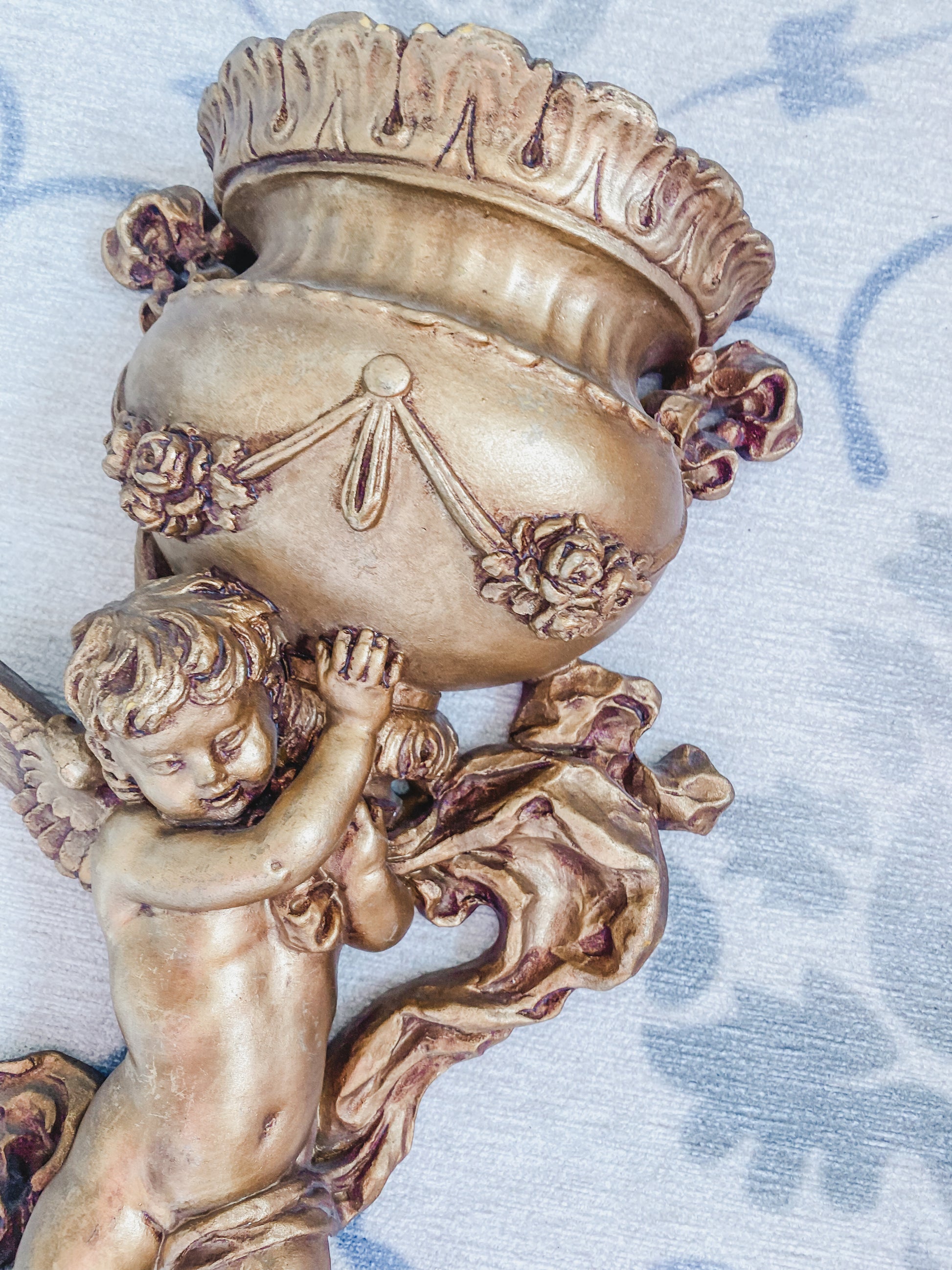 This charming putti cherub figurine stands 14.25” t carrying an urn on its shoulder with beautifully detailed craftsmanship. Im not sure the material. I don’t think this is plaster but seems to be a more modern composition designed to mimic its look. A lovely decorative piece with a classic feel.