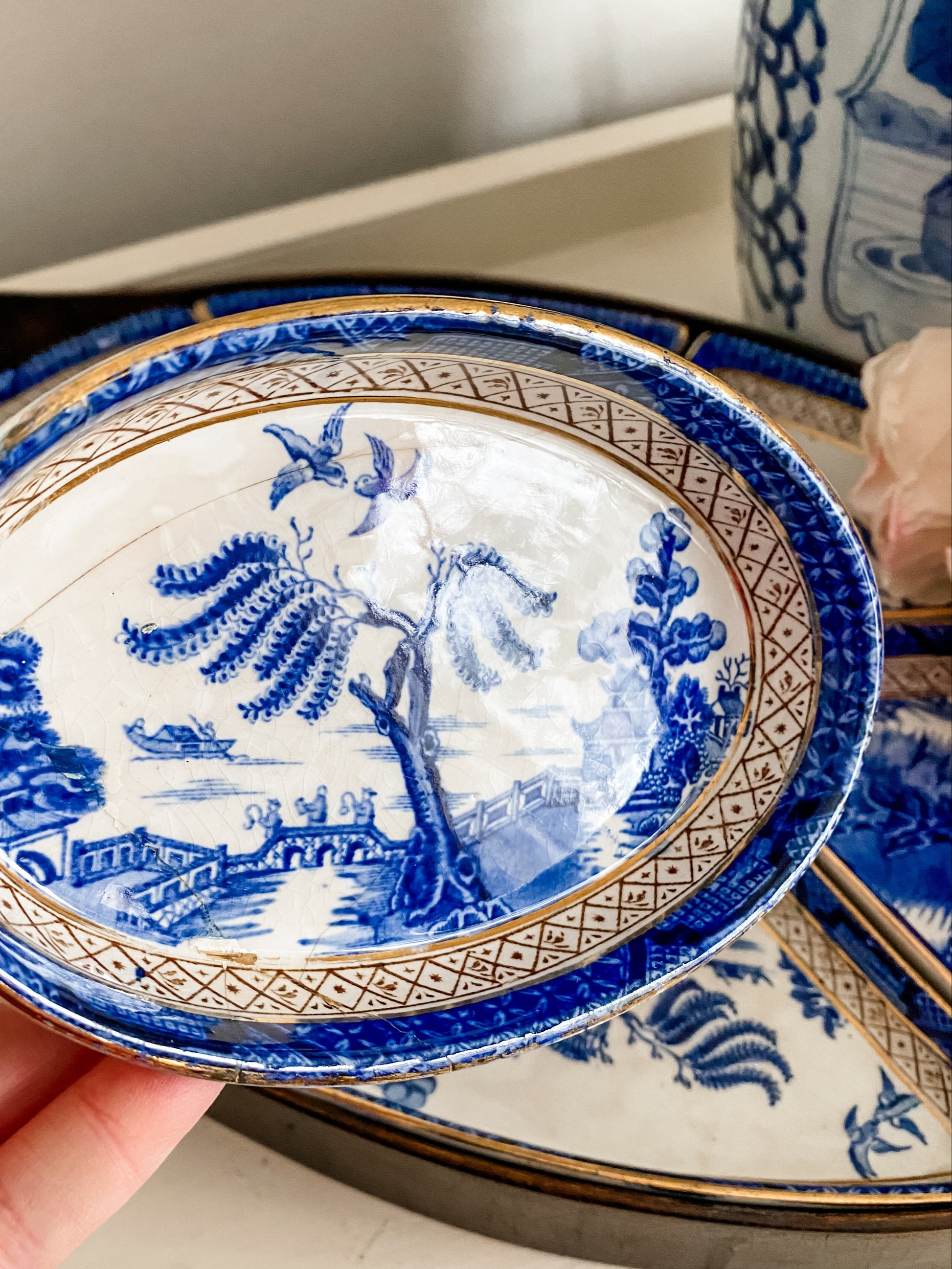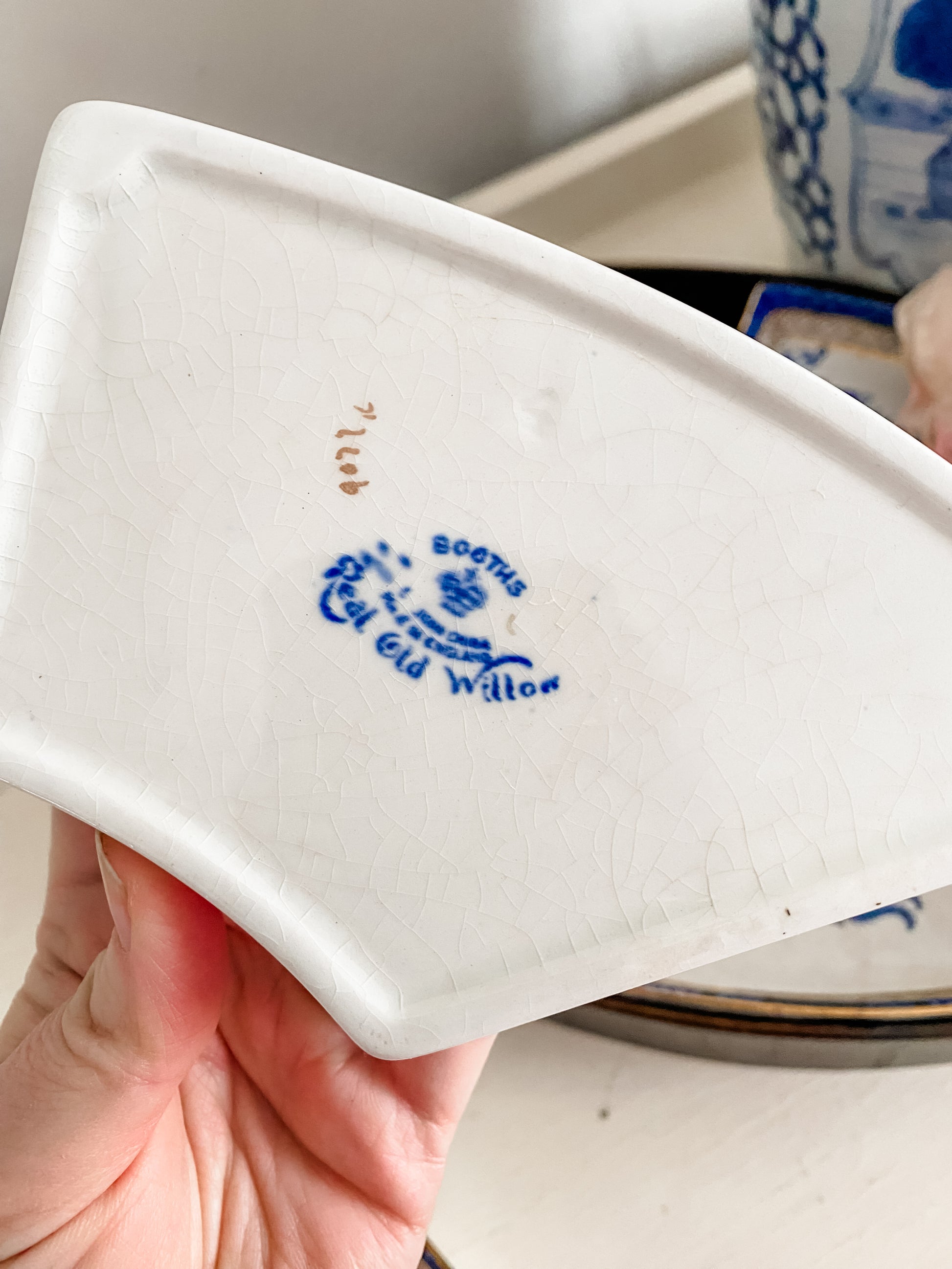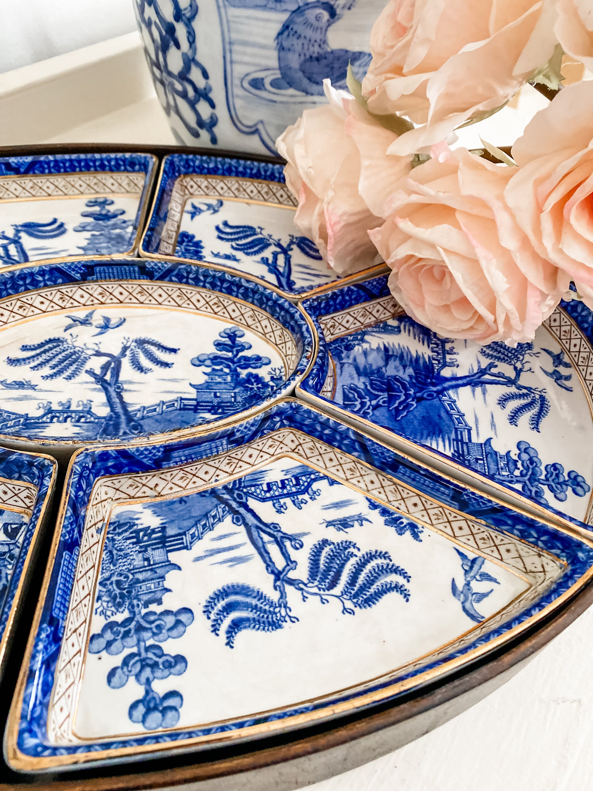 This English Booths Real Old Willow porcelain serving tray is a stunning example of classic blue and white transferware, featuring the iconic Willow pattern that has been cherished for generations. Measuring 12" x 16.5", it showcases intricate detailing, from delicate pagodas and bridges to graceful floral and geometric borders. Produced by Booths Ltd., a renowned English pottery manufacturer founded in 1864 in Tunstall, Staffordshire, this tray embodies the refined craftsmanship that made Booths famous. Known for its high-quality glazes, deep blue hues, and exquisite detailing, Booths' Real Old Willow pattern is considered one of the finest interpretations of the classic Blue Willow motif. What makes this tray particularly rare and collectible is its puzzle-style design, where segmented porcelain pieces fit perfectly into a wooden tray—a unique and unusual variation within Booths’ production history. These specialized serving sets were likely produced in limited quantities, making them a highly sought-after addition to any blue and white china collection or refined table setting. The center piece appears to have been repaired at some point, otherwise excellent antique condition.