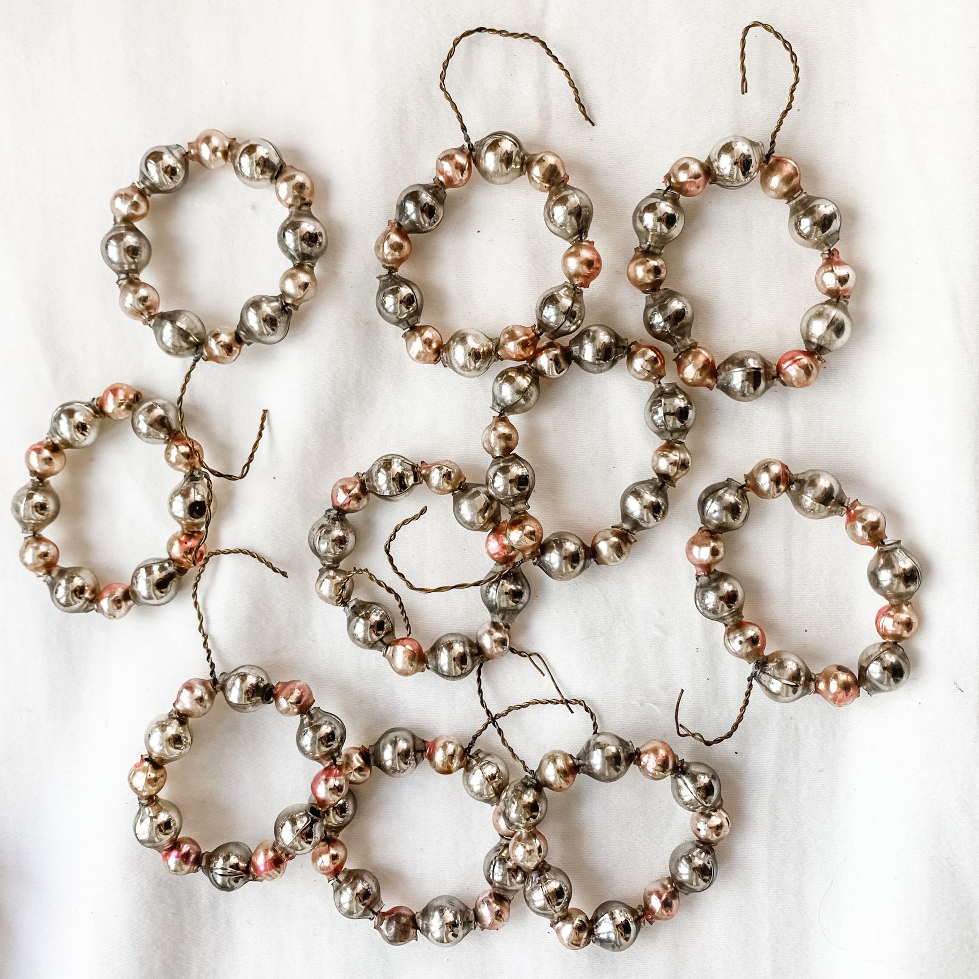 These charming antique mercury glass beads were shaped like wreaths on wire with hooks. They look amazing on the Christmas tree with their unusual shape. 1.5" D. Sparkly silver color. Very unique.