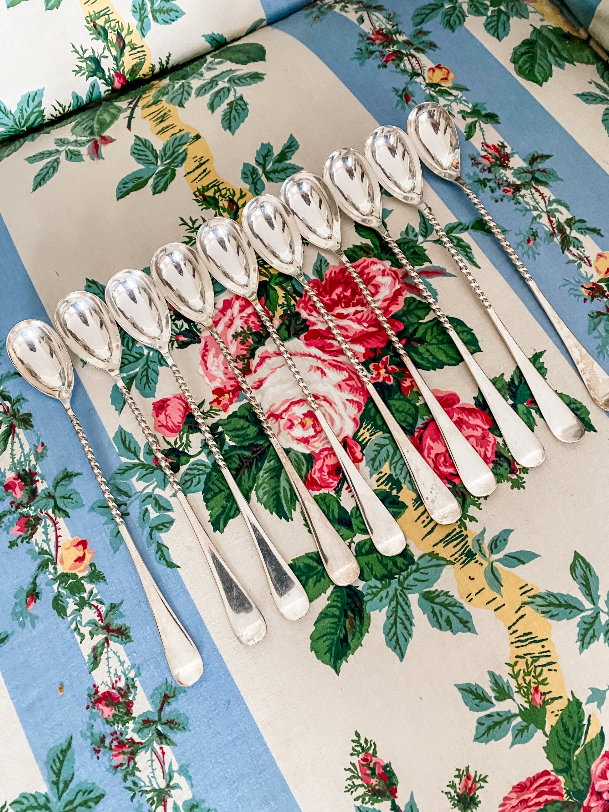 Lovely set of 10 antique silverplate iced tea spoons with beautifully turned handles. 8.25" long.