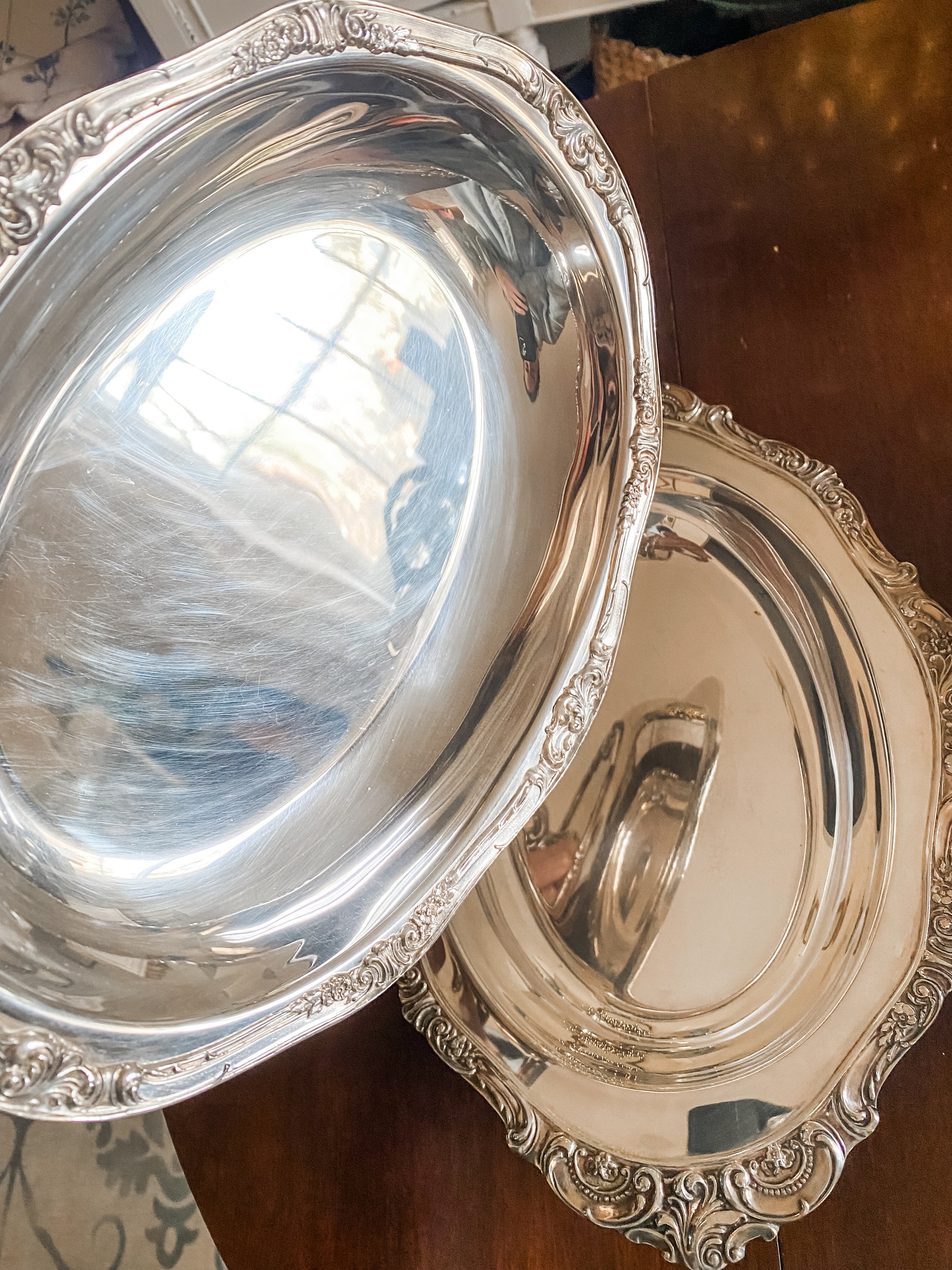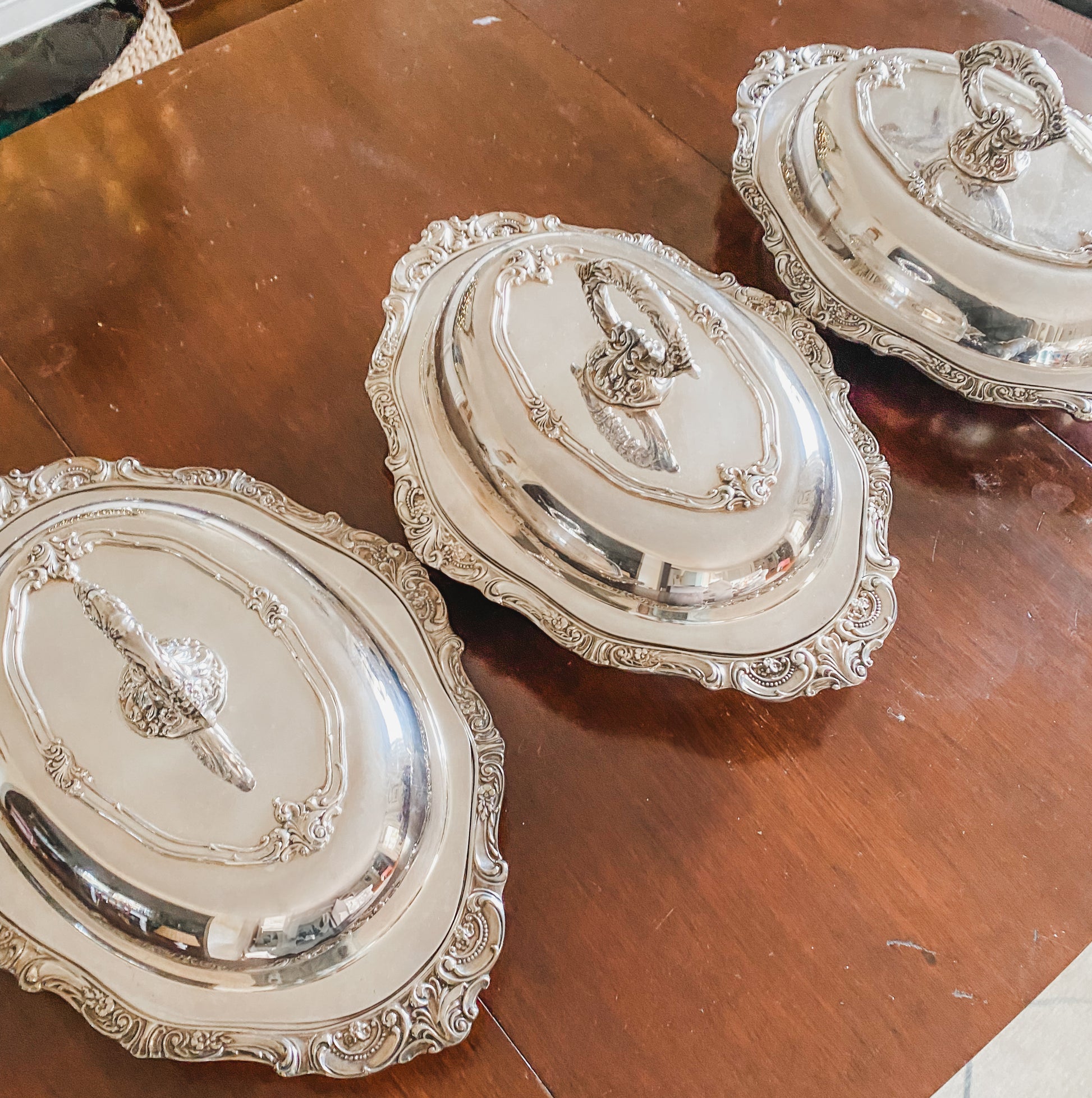This set of 3 FABULOUS covered vegetable servers. These are older Wallace pieces, and the quality is unparalleled. You can see how beautiful and intricate they are on the outside, but even when you take off the cover, the underside is decorated in the same flourishes and swirls as the top, making using this a truly elegant experience. A real treat to have a set of 3! They are each 14" x 11" wide and the silverplate is in excellent condition. The price is for all 3.