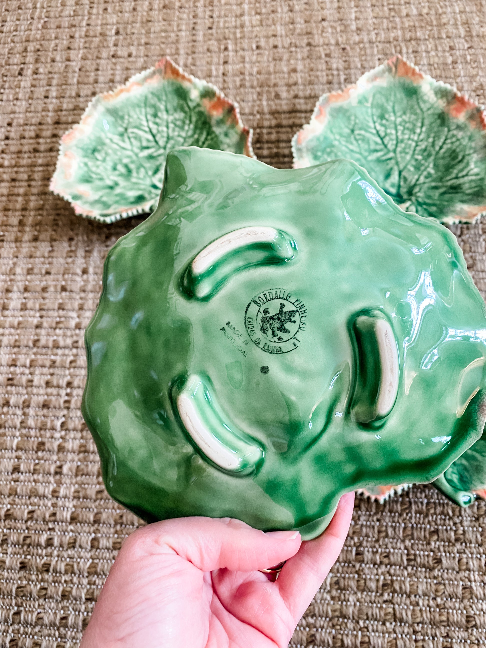 This is a really beautiful set of four leaf dishes by Bordallo Pinheiro, known for their iconic Portuguese ceramics and lifelike botanical designs. These are done in that classic majolica style they are so well known for, with incredible veining throughout the leaves.