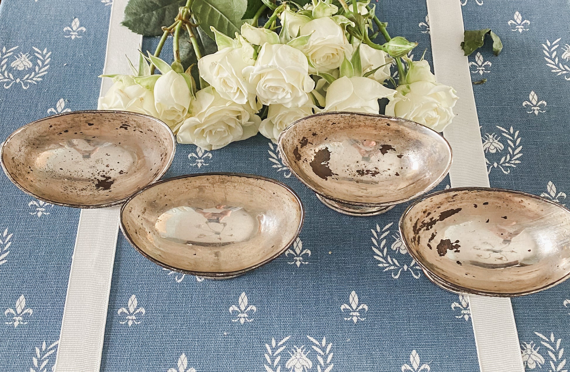 Miniature antique sets like this are such delightful finds! This charming set of four petite nut bowls, crafted in Old Sheffield Plate, dates to the late 1700s – early 1800s and showcases the refined elegance of the era. Each bowl sits gracefully on a pedestal base, with an oval-shaped form that adds to its distinctive appeal. Old Sheffield Plate was an innovative 18th-century technique where a layer of sterling silver was fused to a copper base, predating electroplating and prized for its durability, craftsmanship, and rarity. Over time, the natural wear reveals glimpses of the warm copper undertones, adding to the set’s character and authenticity. Each bowl measures 2.25" tall, 2.25" deep, and 3.5" wide, making them a rare and wonderful addition to any collection.