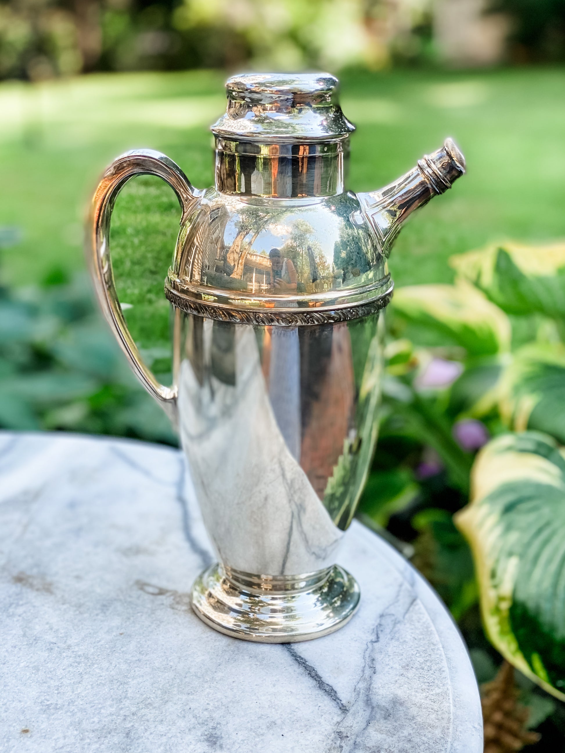 Paired with the appropriate cocktail ingredients this antique silver plate cocktail shaker would make a wonderful and much appreciated gift! Or buy this charming antique for your own bar. This one was made by Pairpoint which began operations in 1890 and is marked EPNS WM Mounts which indicates the process in and which it was made and the type of metal used. Dmall dent in the lid of the pourer and some tarnish. 11.25” Tall.