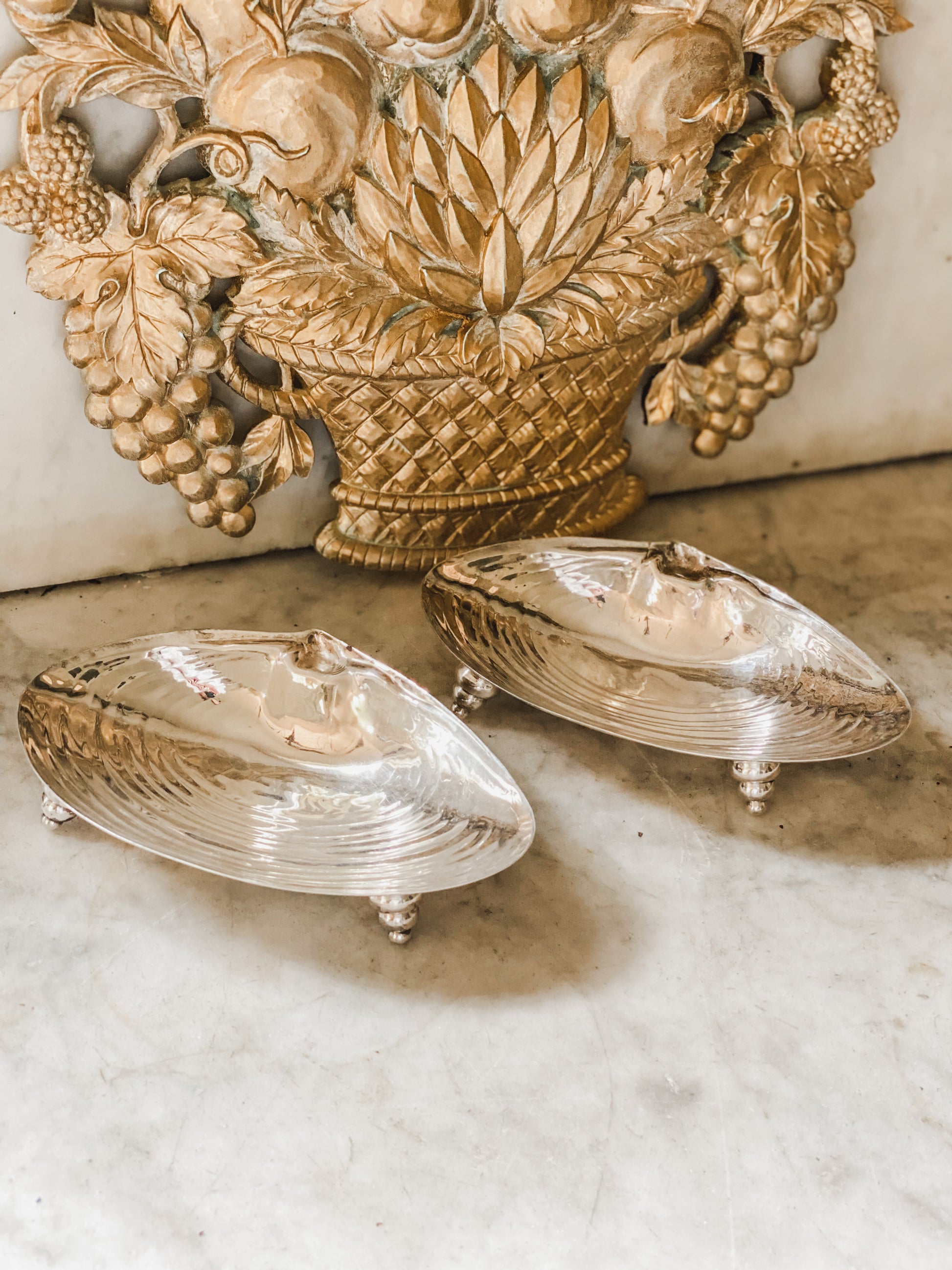 These two heavy seashells are silver plated, sit on small feet and artistically reflect the actual details of a clam. Use as an addition to any attractive vignette or serve any small condiment or dish. Very high quality, excellent antique condition, 6” x 4”.