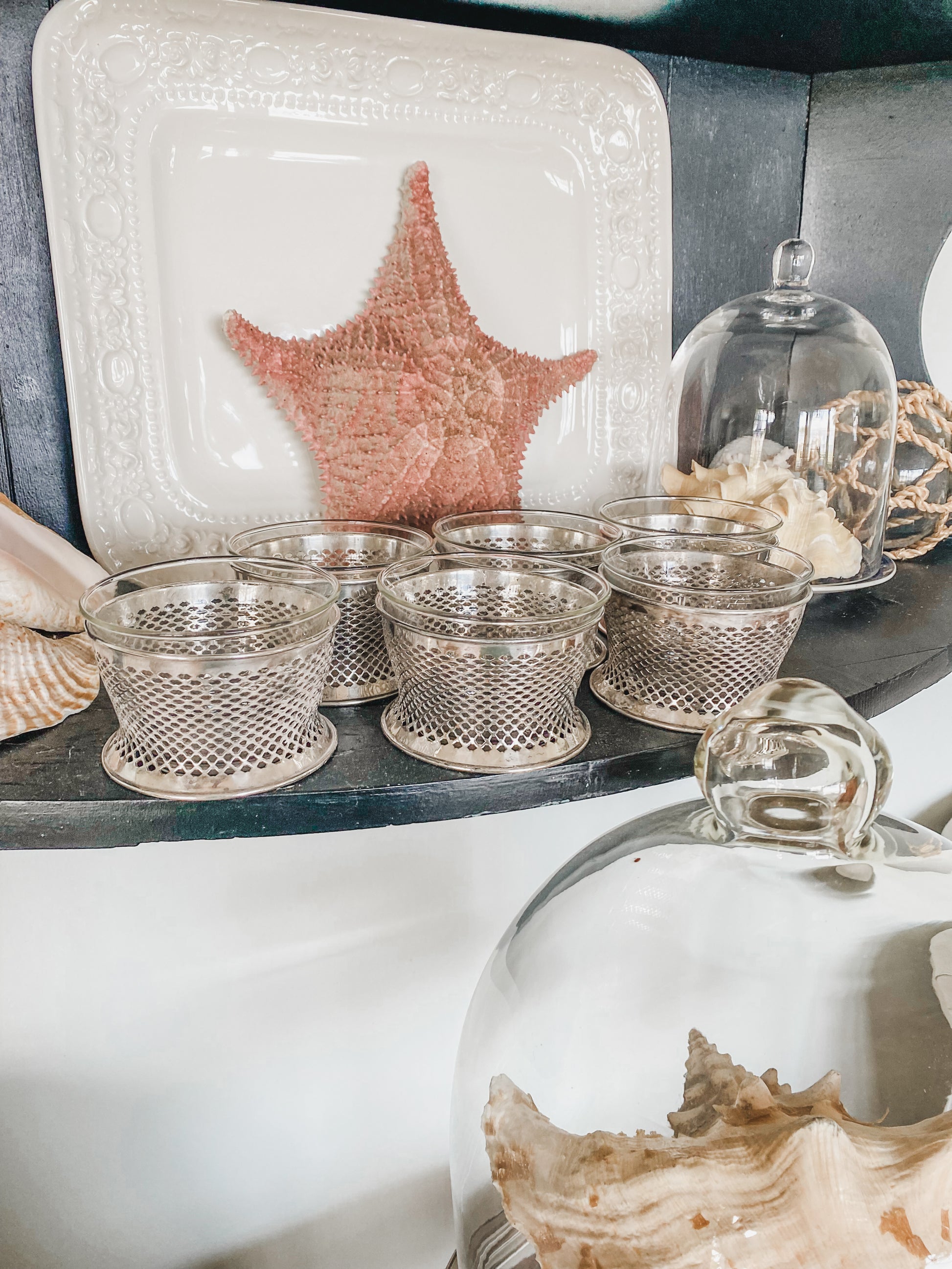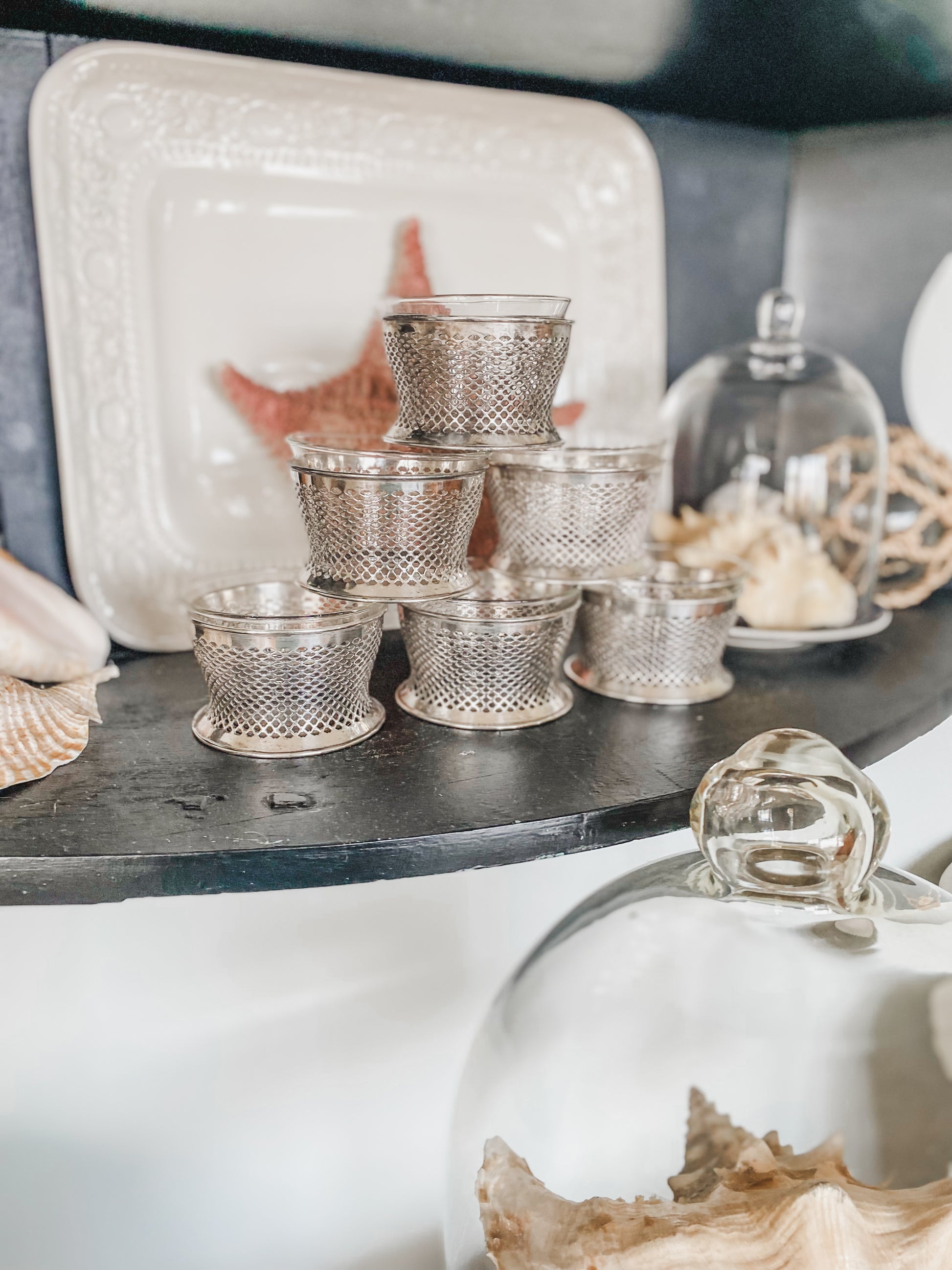 These are always a wonderful find! Set of 6 sherbert cups. The delicate little glass rests inside a pierced silver stand. You will love serving desserts in these little cups! I believe these are sterling but I'm not positive as they are unmarked so I am selling them as silverplated. Made in Germany. They are each 3 x 2.75" tall.