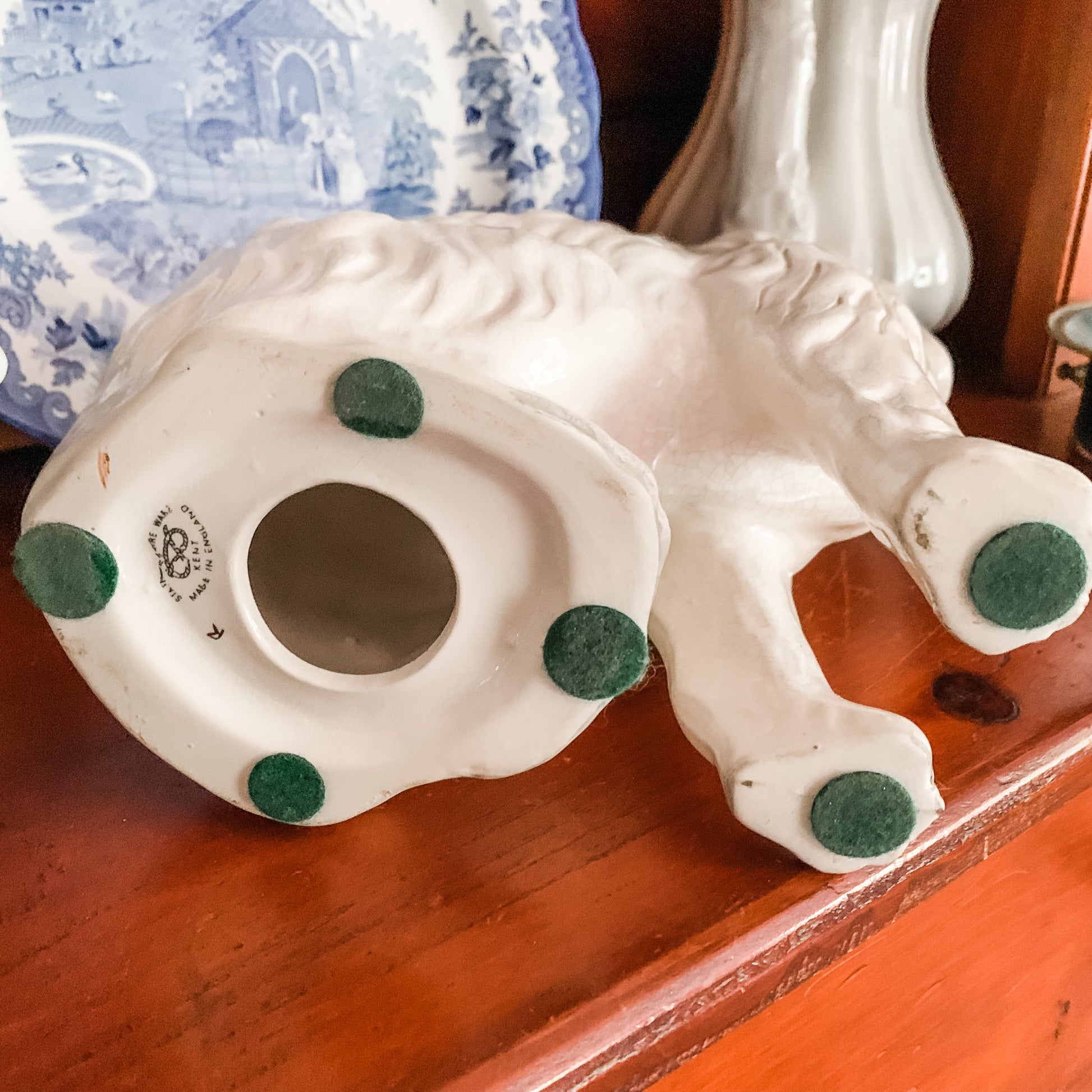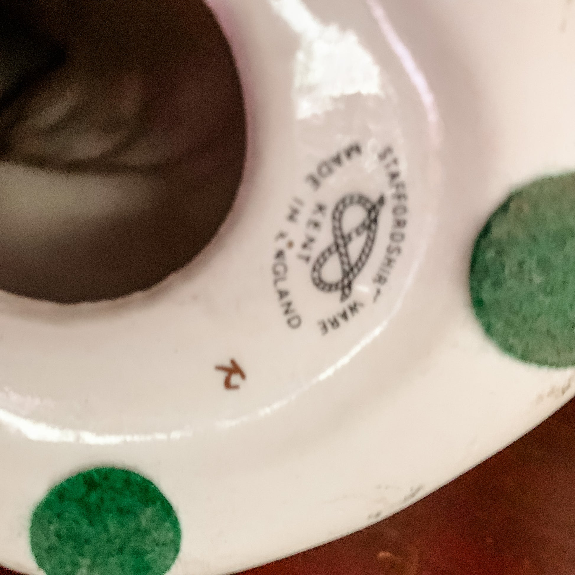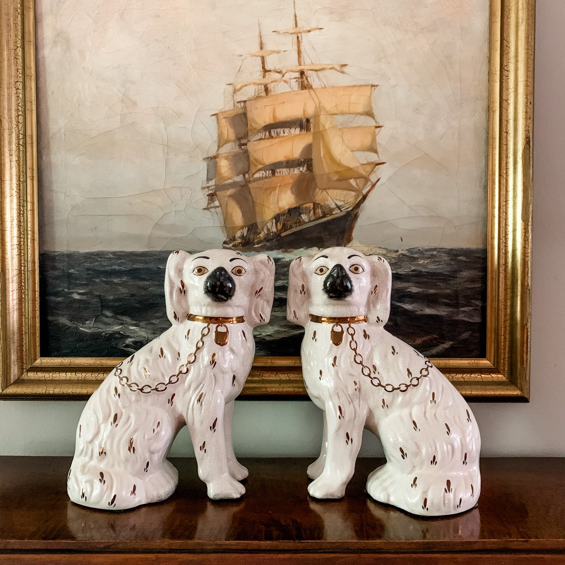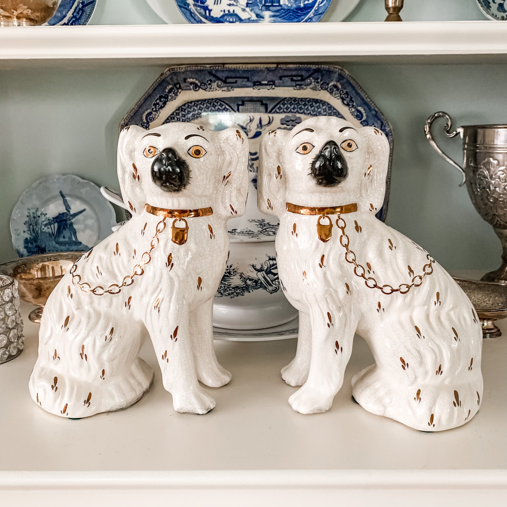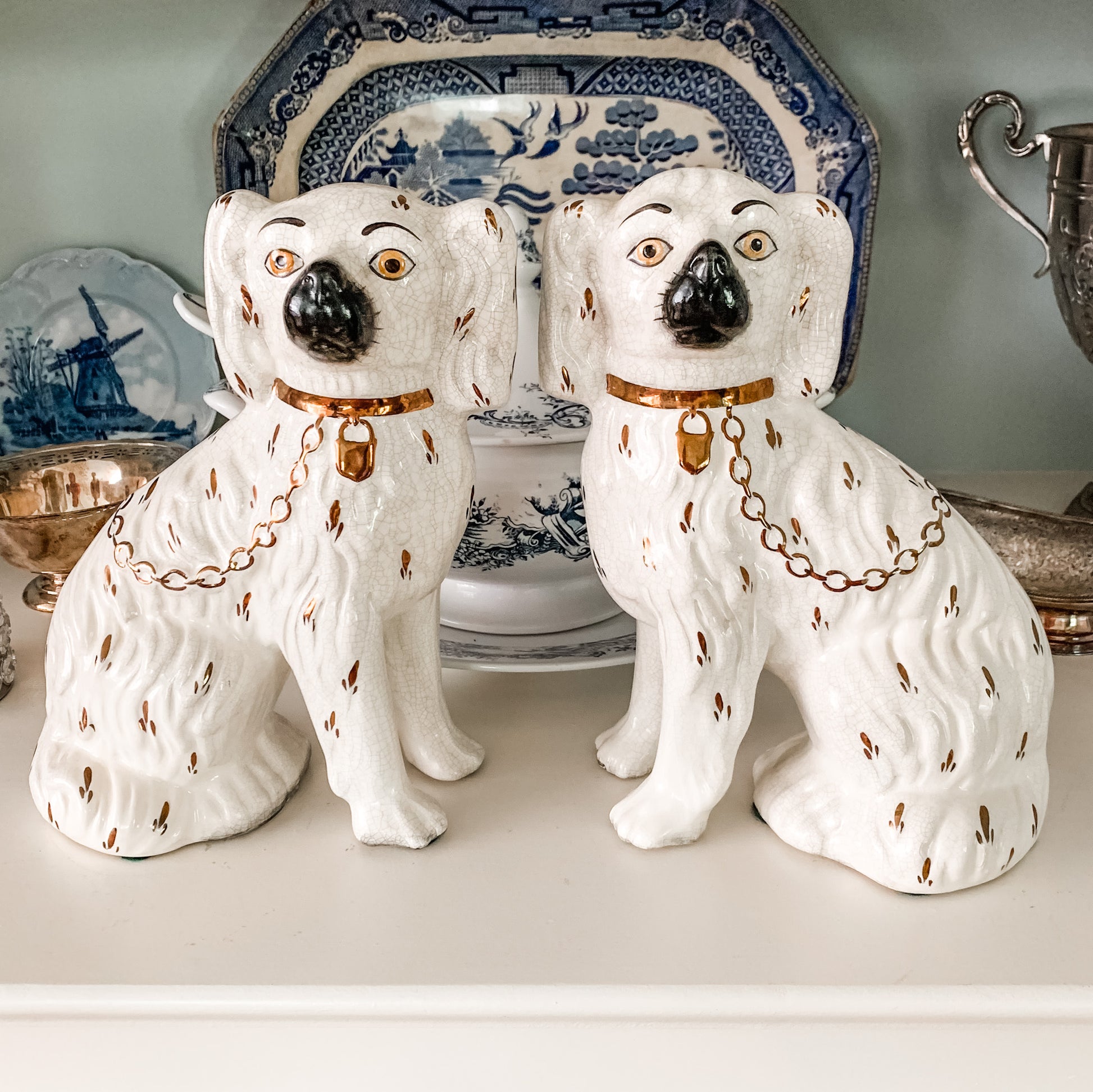 This pair of Staffordshire Dogs has to be one of my favorite sets. Look at those adorable faces! They are hand painted but have cute, friendly expressions! This pair has all of the patina you would want with a crackled paint that is till in very good condition. I love how their tails curl around the front. Hand painted gold details on the front and back. They stand very tall at 11" x 9" wide and 5" D. Excellent condition. Faint hairline crack in the glaze on back of one does not go through the porcelain. They are marked Staffordshireware Kent England. Probably made in the mid to early last century.