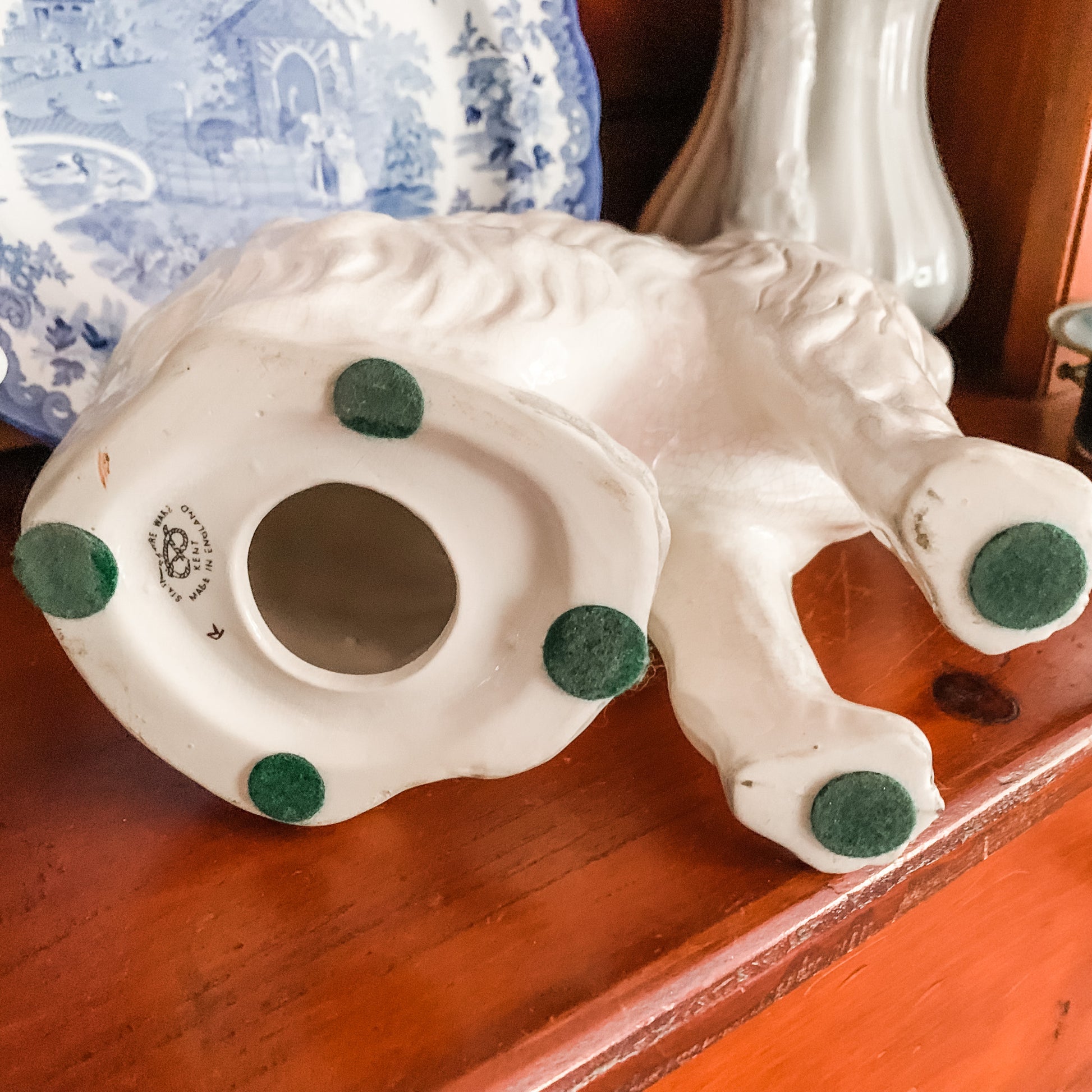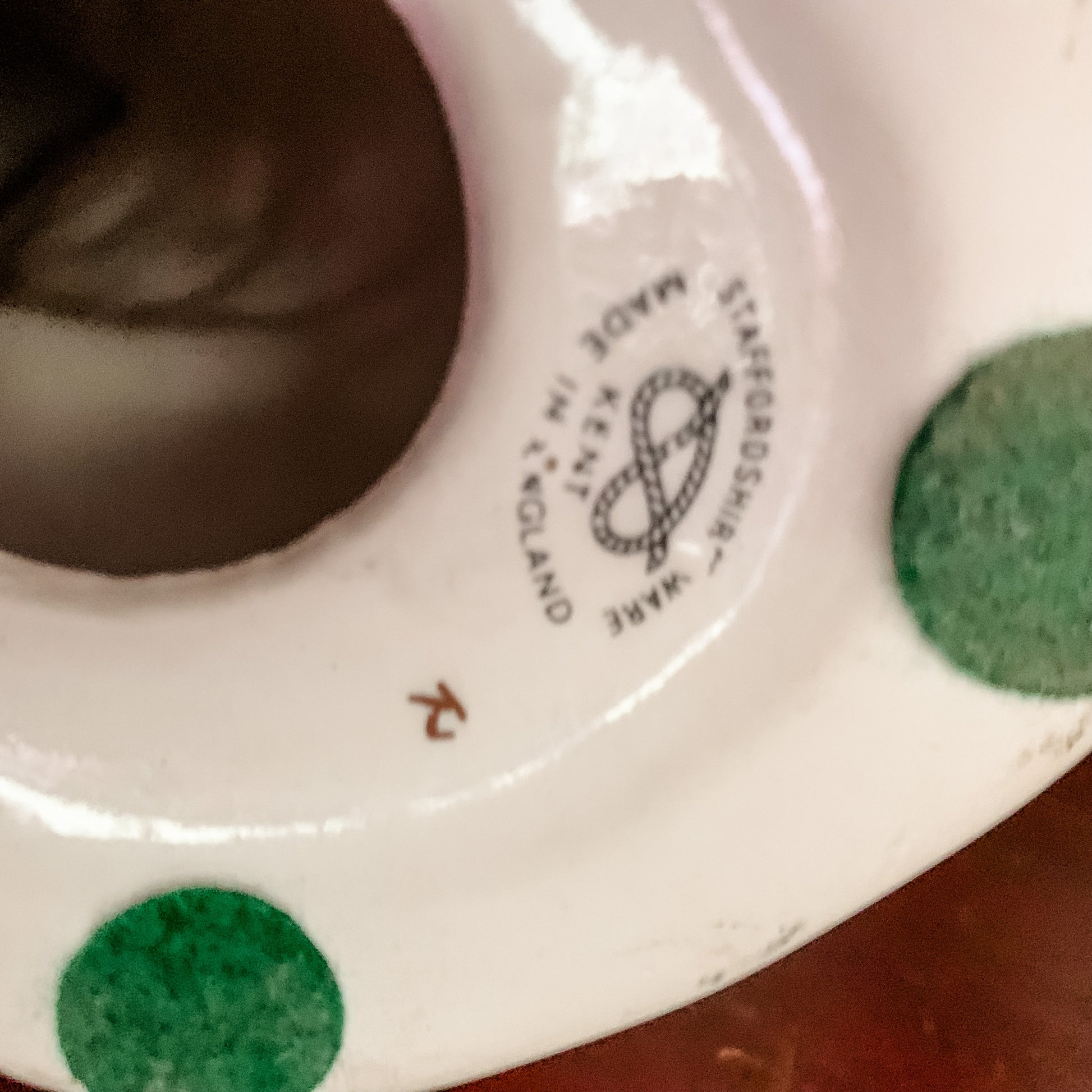 This pair of Staffordshire Dogs has to be one of my favorite sets. Look at those adorable faces! They are hand painted but have cute, friendly expressions! This pair has all of the patina you would want with a crackled paint that is till in very good condition. I love how their tails curl around the front. Hand painted gold details on the front and back. They stand very tall at 11" x 9" wide and 5" D. Excellent condition. Faint hairline crack in the glaze on back of one does not go through. They are marked Staffordshireware Kent England. Probably made in the last century.