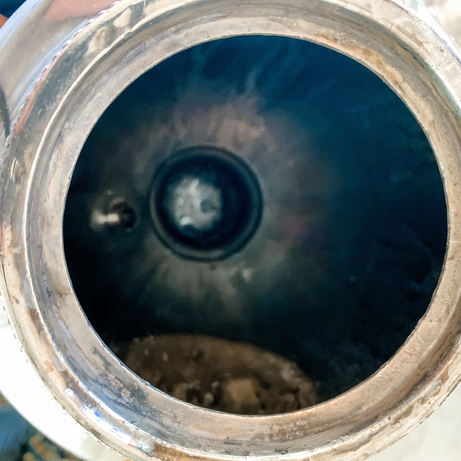 Wow, this antique silver plate beverage dispenser will look stunningly dramatic wherever you use it. It will serve water, lemonade, tea or coffee. It is ornately designed with lovely acanthus leaf tall legs which join the base with fabulous flowers and leaves. It has beaded trim as well a greek key patterned banding. Guests will be impressed with the pull down dispenser which is designed with a wood accent. The handles are decorated with a flower medallion. The interior is in very good antique condition and the bottom has a place to hold a candle to keep the beverage warm. (Candle holder is not original). The condition of this very heavy piece is excellent. It appears that is was rarely used as their are no surface scratches or dings which is normal with a piece of this age. There is a small monogram on the back side. 17" tall x 10 x 10.