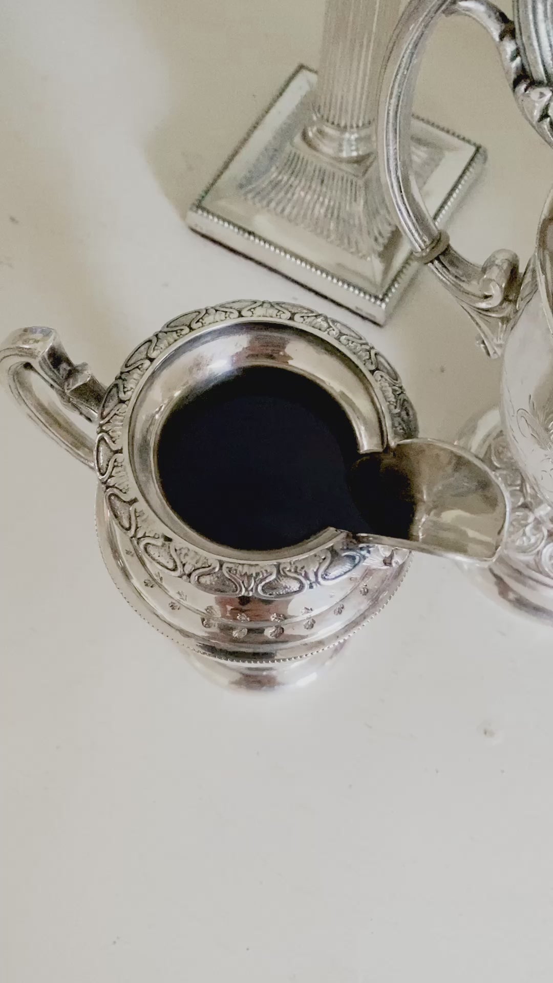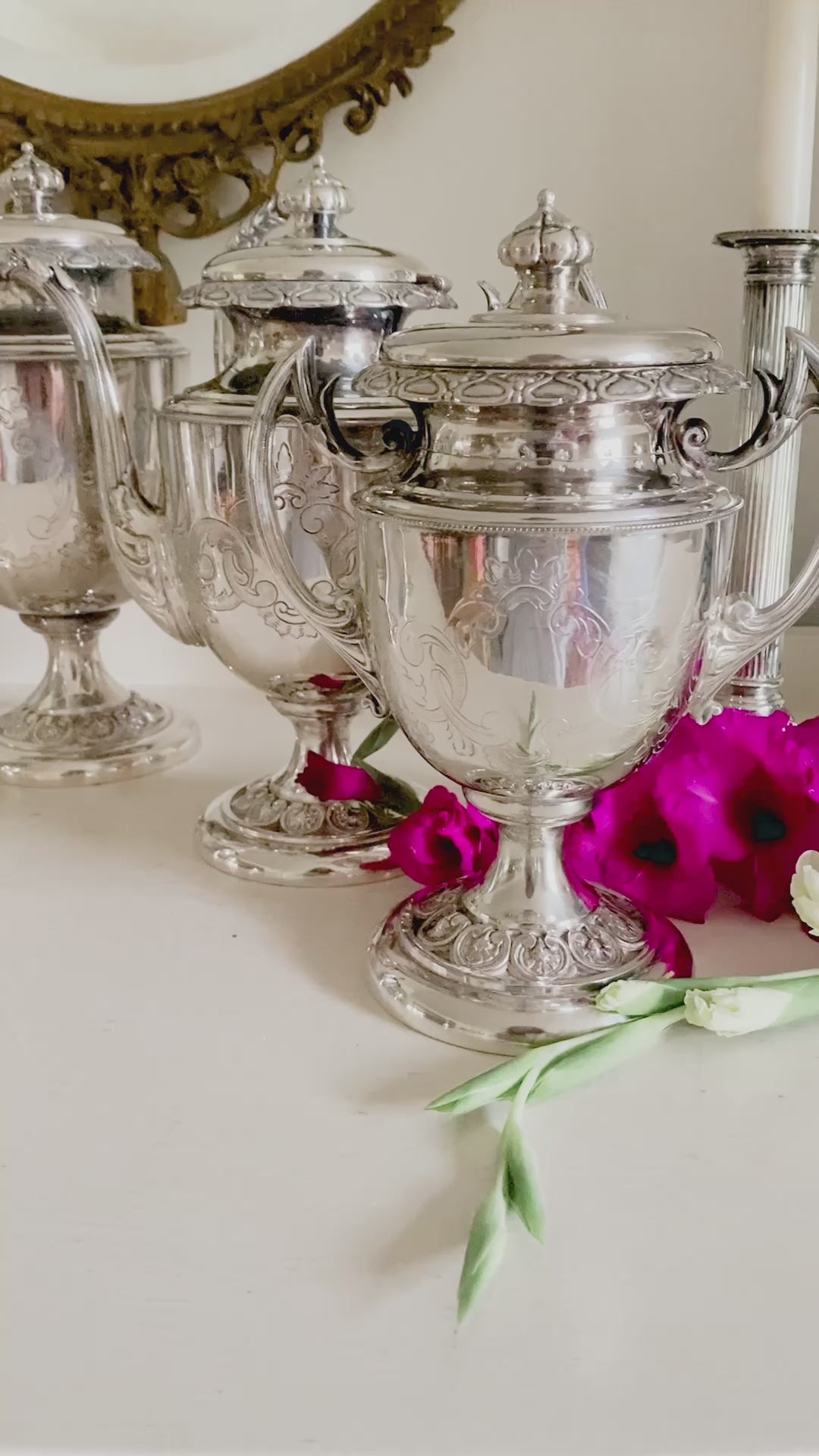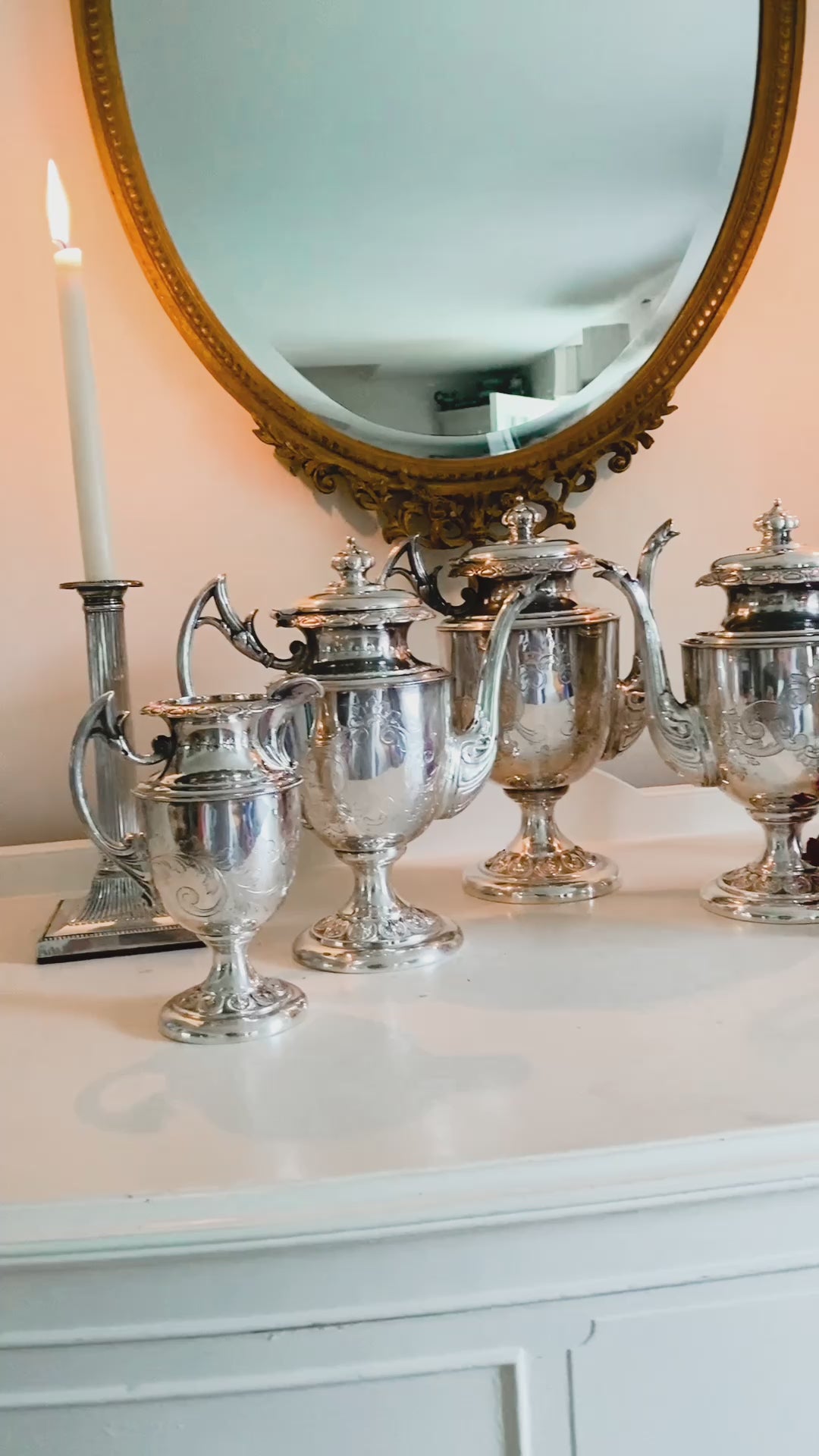 Here is a stunning tea set made by Kauffman in Philadelphia in the mid-1800s. It exudes elegance with three distinct pots: one for tea, one for coffee, and one to hold hot water for diluting strong drinks. It also includes a creamer and sugar pot, making this set complete. The silverplate remains in excellent condition, and each piece stands tall and graceful, adorned with the most beautiful etched details. The floral finial makes a striking statement, and the elegantly designed arms enhance the set's exquisite beauty. This set stands tall with the tallest pot measuring 11.5" tall