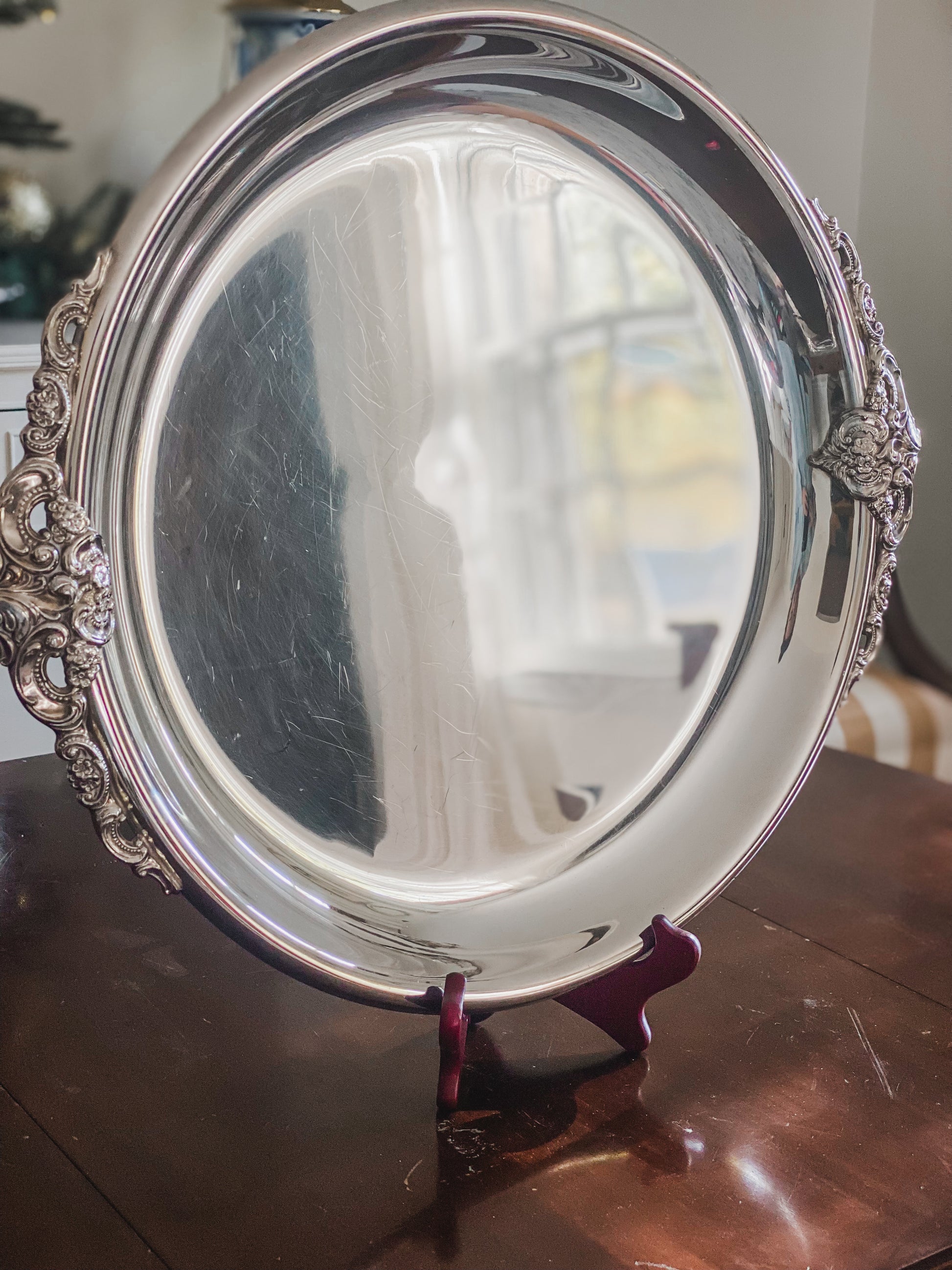 Beautiful! This tray reminds me of a piece of jewelry. It is gleaming, and I can just imagine it being piled high with sandwiches or treats at your holiday gathering. A part of the newer collection of Wallace's Baroque line, this one has the same beautiful handles that surround a more modern tray. I love that the handles dip down into the bowl like a bleeding heart. I also really like that the tray has a lip that comes up about 2" making it perfect to serve food that is a little more substantial. It is 19.5" x 17" and in very good condition with some scratches on the center to the silverplate. These will be covered by whatever you are serving so I wouldn't worry too much about them.