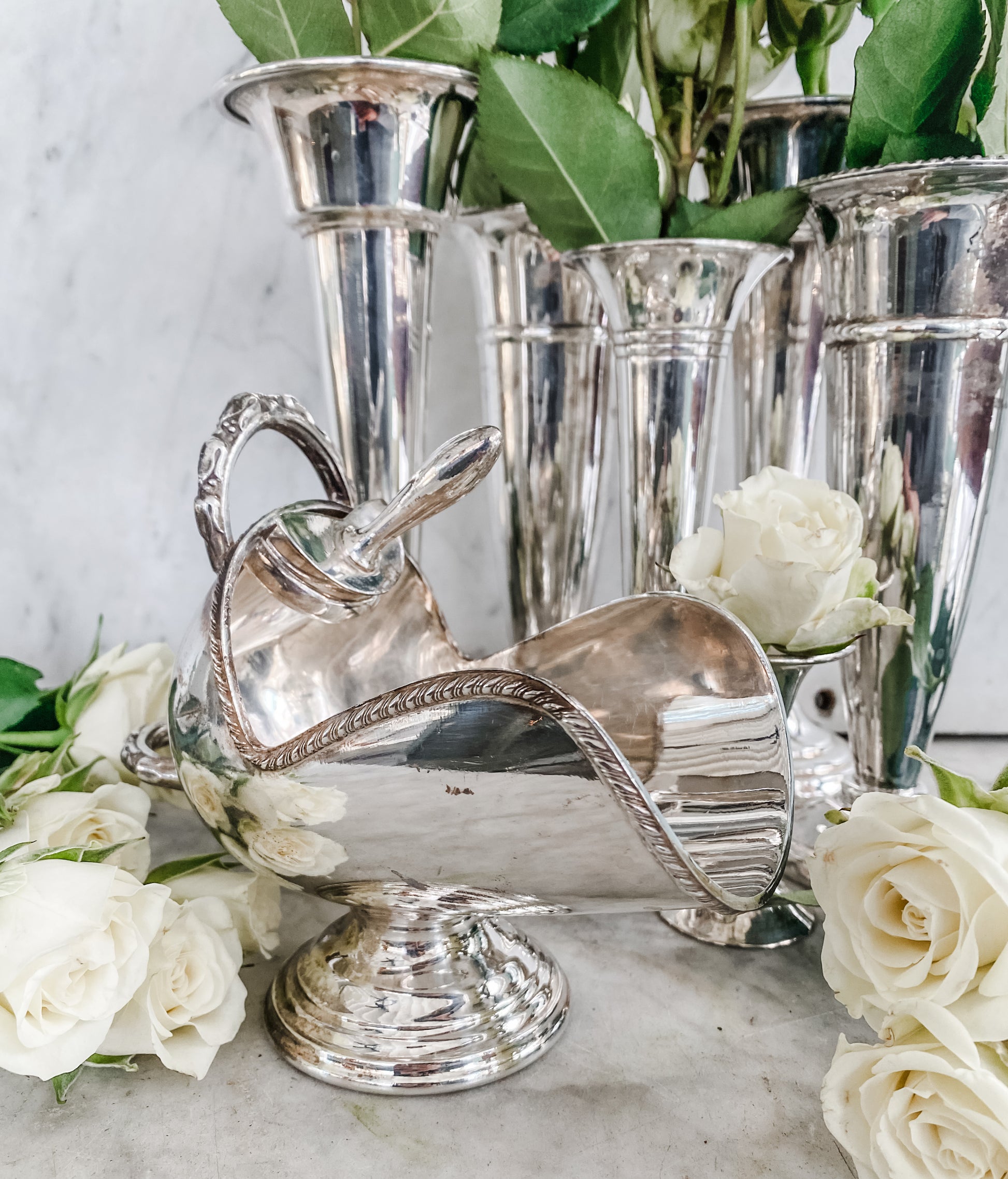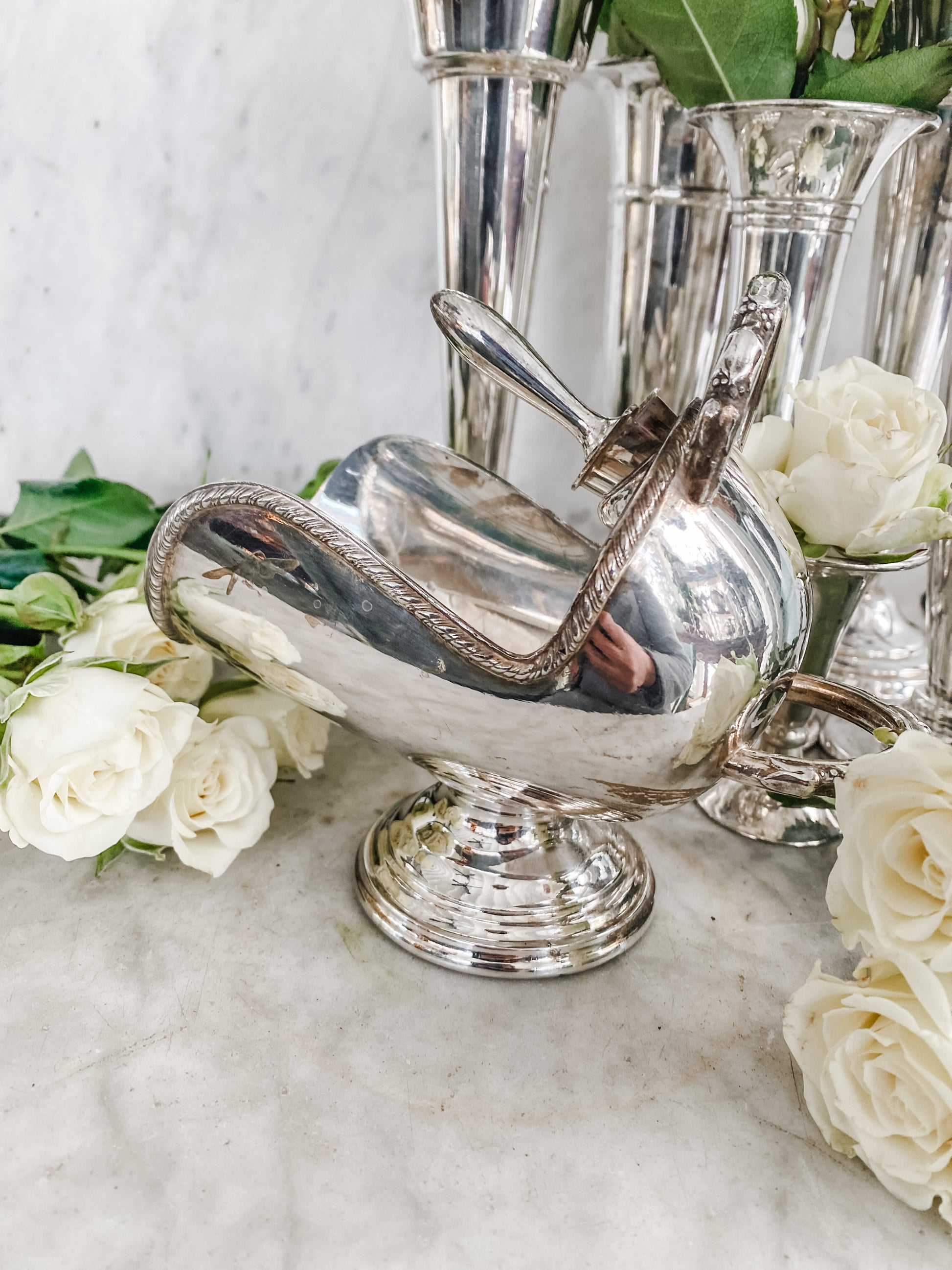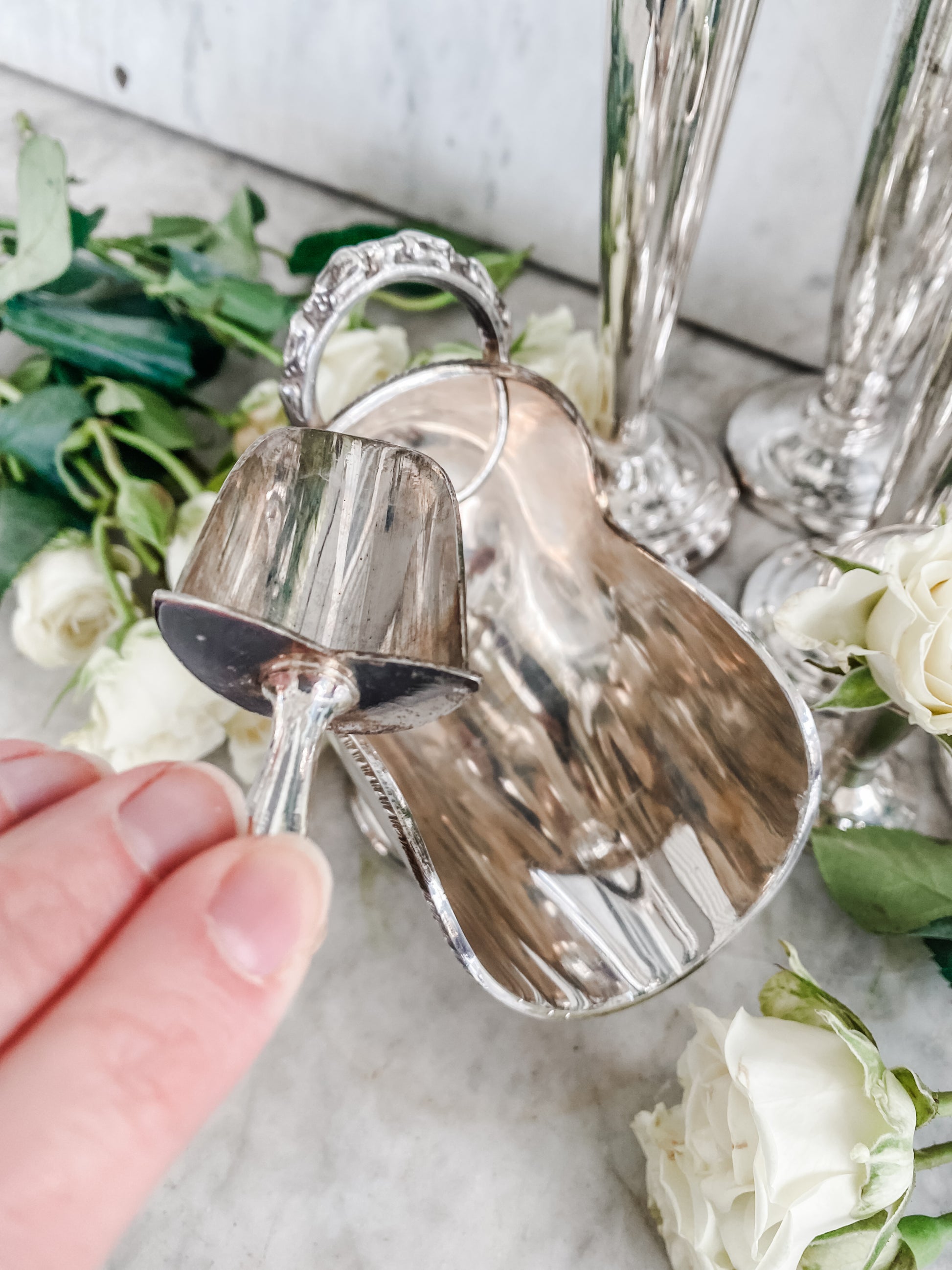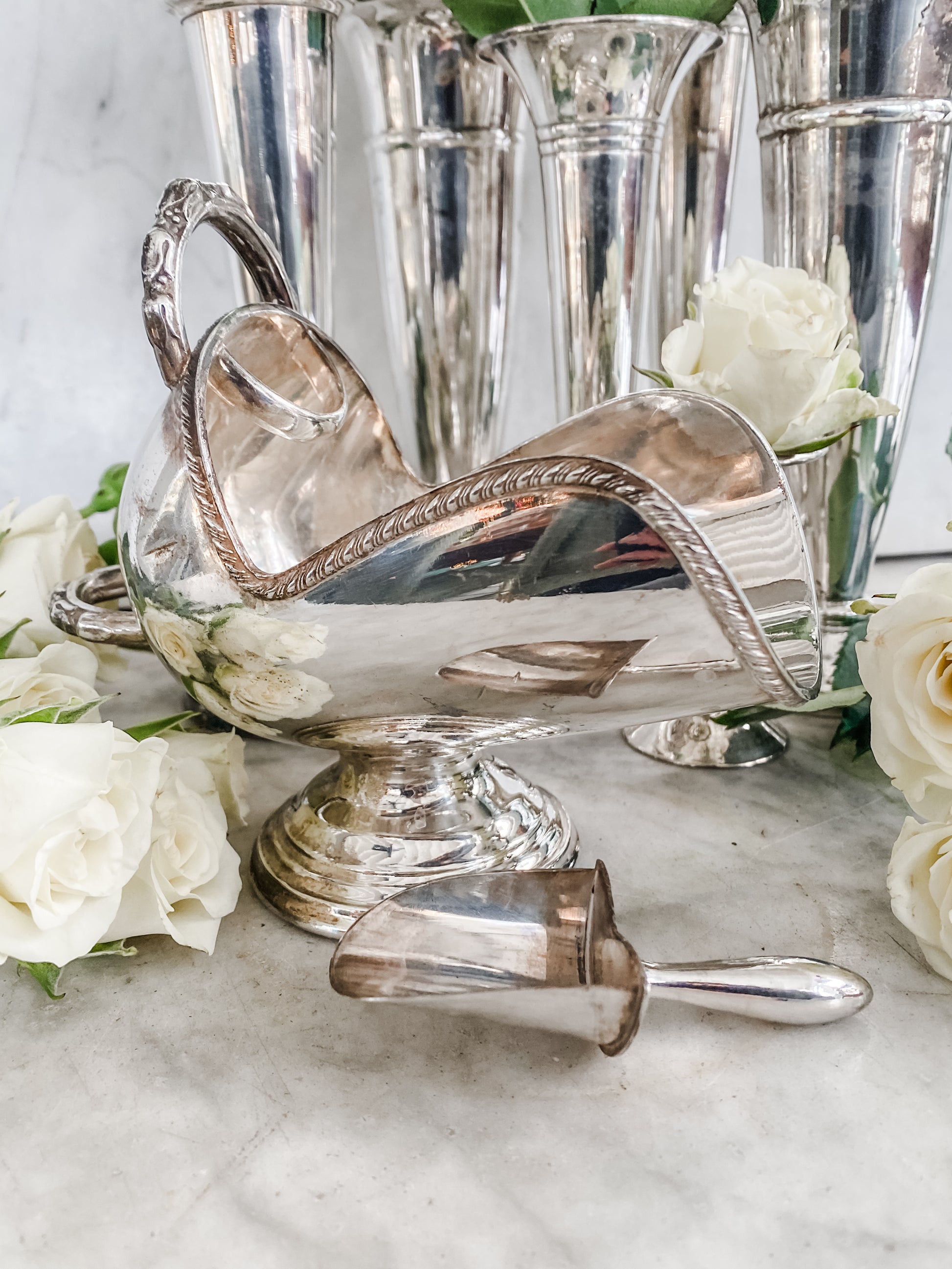 This beautifully crafted piece was made in England and remains in excellent antique condition. Silverplate. A rare find, especially with the scoop intact! 6.5" W x 5" H