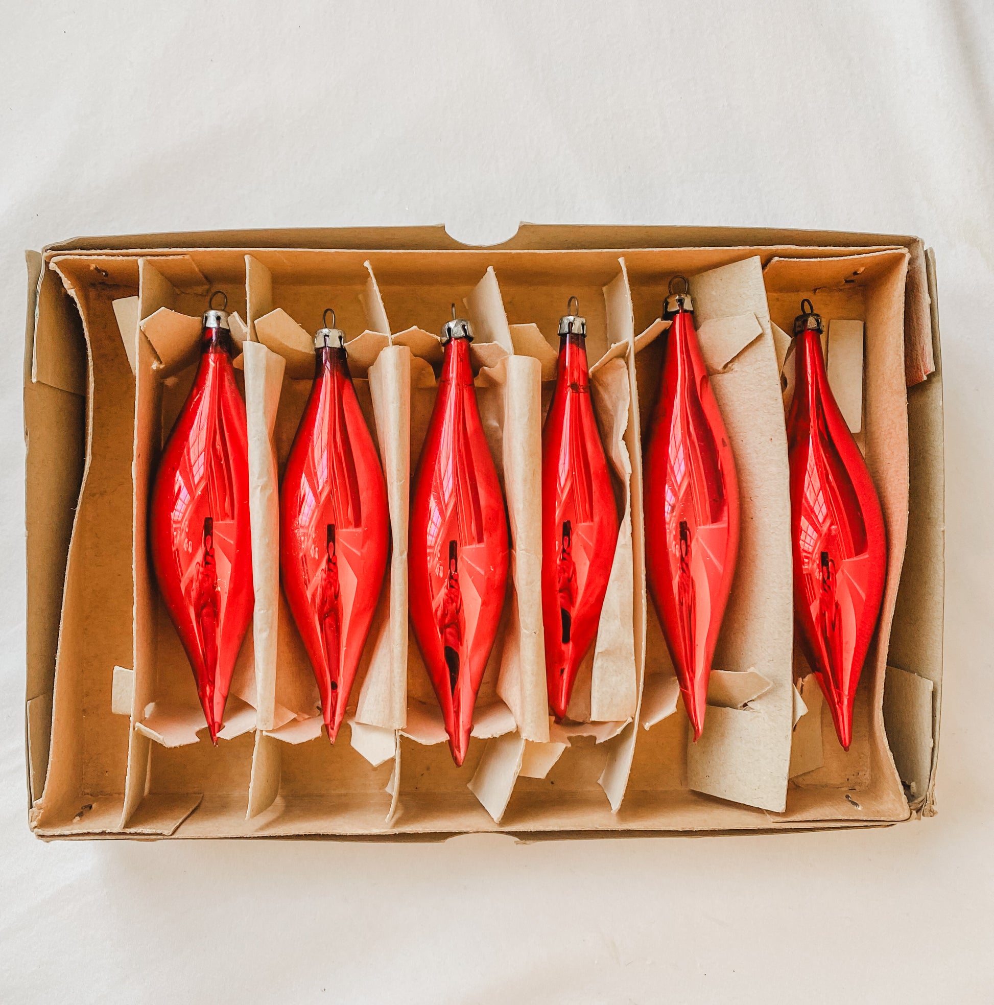 These blown glass Christmas icicles or tear drops look fabulous on a tree, accenting the tips of the branch with a sparkle. The shape contrasts nicely with the traditional rounded ornament. 4.5" long.
