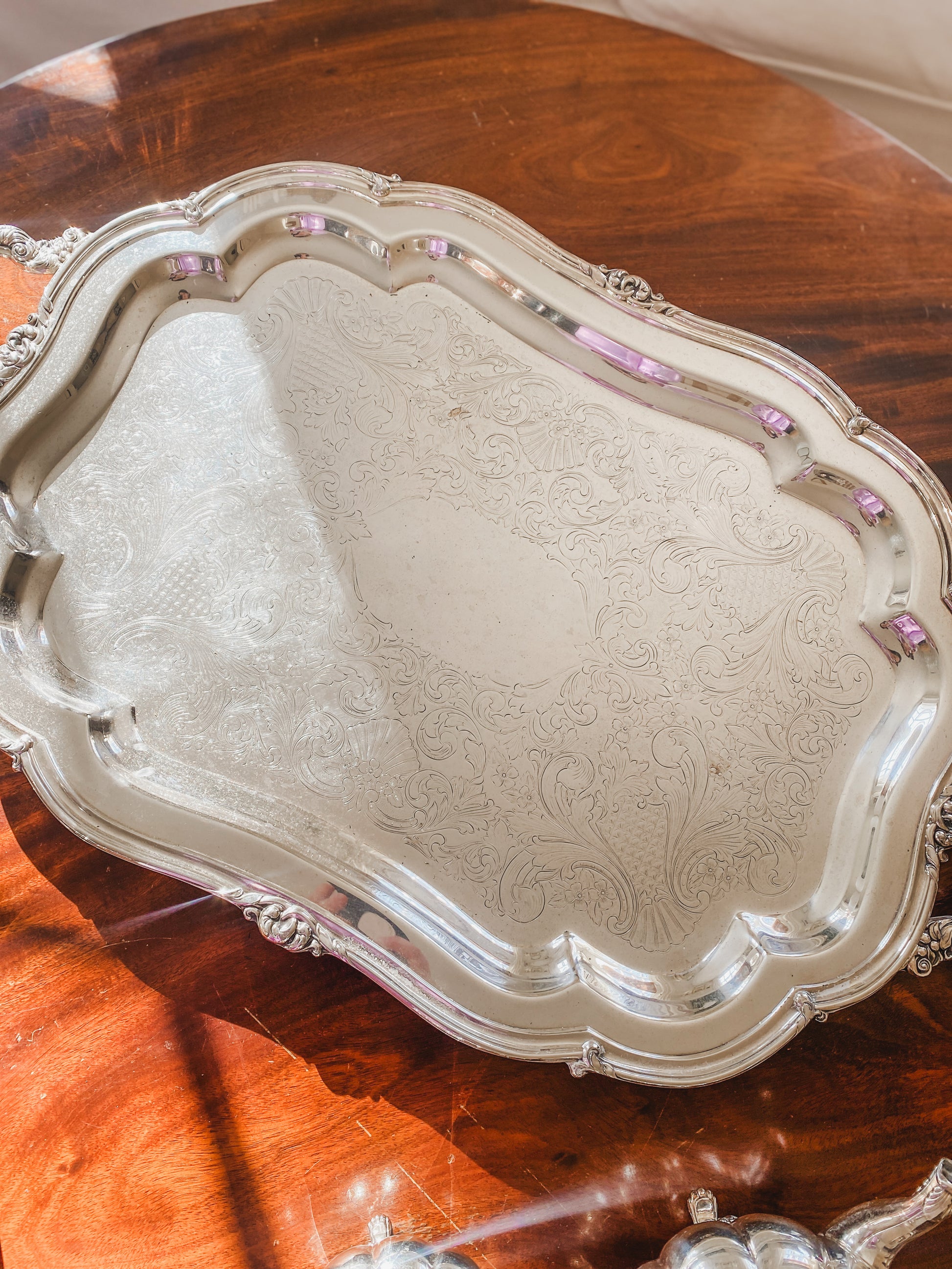 The tray is especially special—original to the set, large, substantial, and with a really lovely etched design that makes it feel like a true centerpiece. It’s one of those sets that instantly pulls a table together.