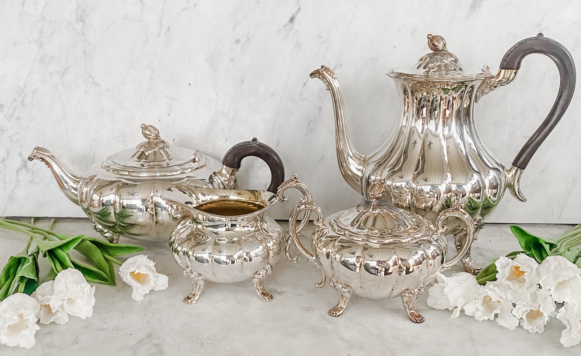This is such a beautiful and complete tea and coffee service in the classic melon pattern. The set includes a teapot and coffee pot, both with carved wooden handles, along with the matching sugar bowl and creamer. Each piece is finished with those wonderful melon-form finials resting on little leaves, and they all sit up on ornate paw feet which gives the whole set such a nice presence.