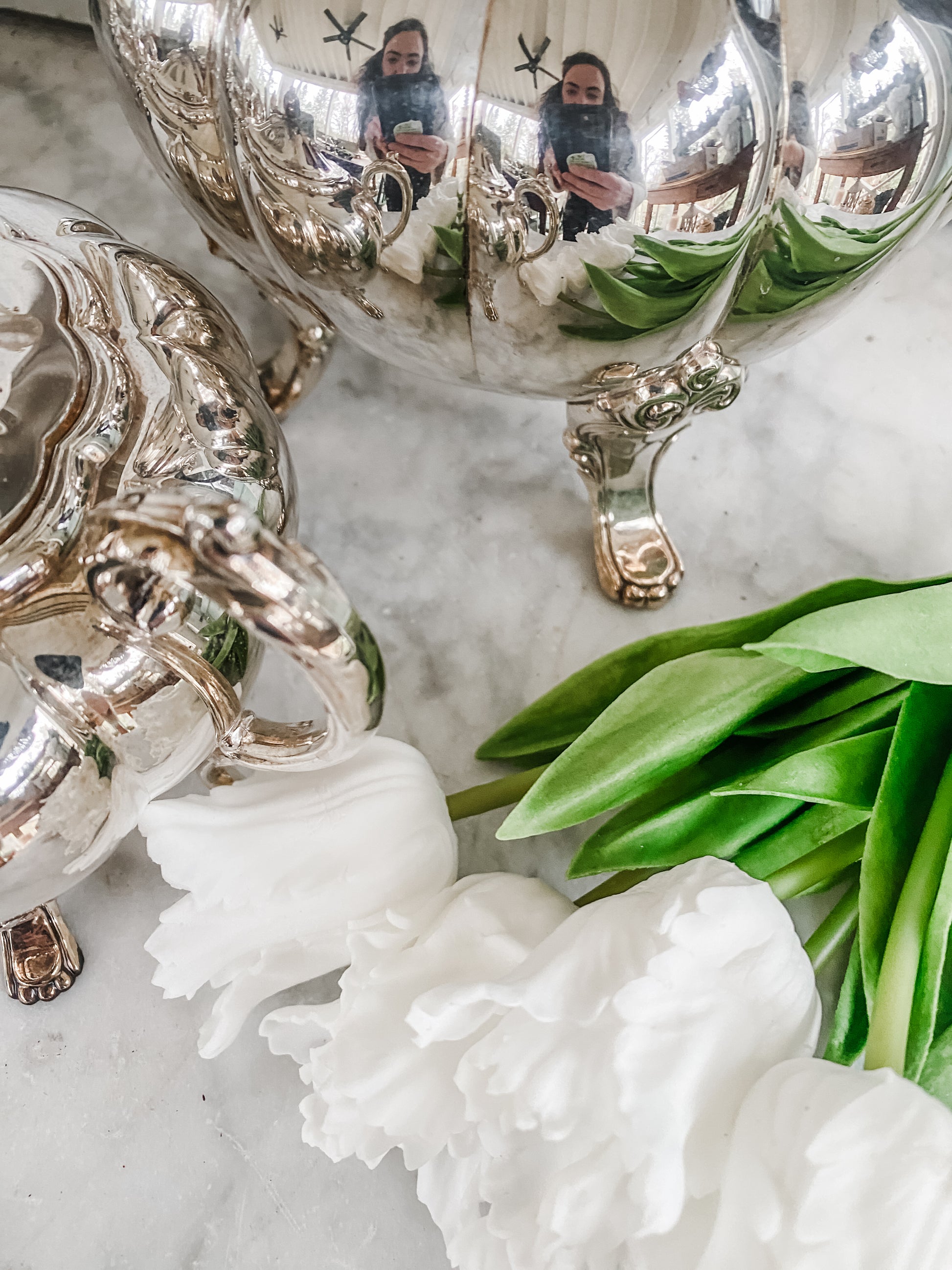 This is a silverplated set in very good vintage condition. There is some natural aging to the finish, including a bit of haziness/tarnish to the silverplate in areas which may or may not polish off, but it is still fabulously shiny and beautiful.