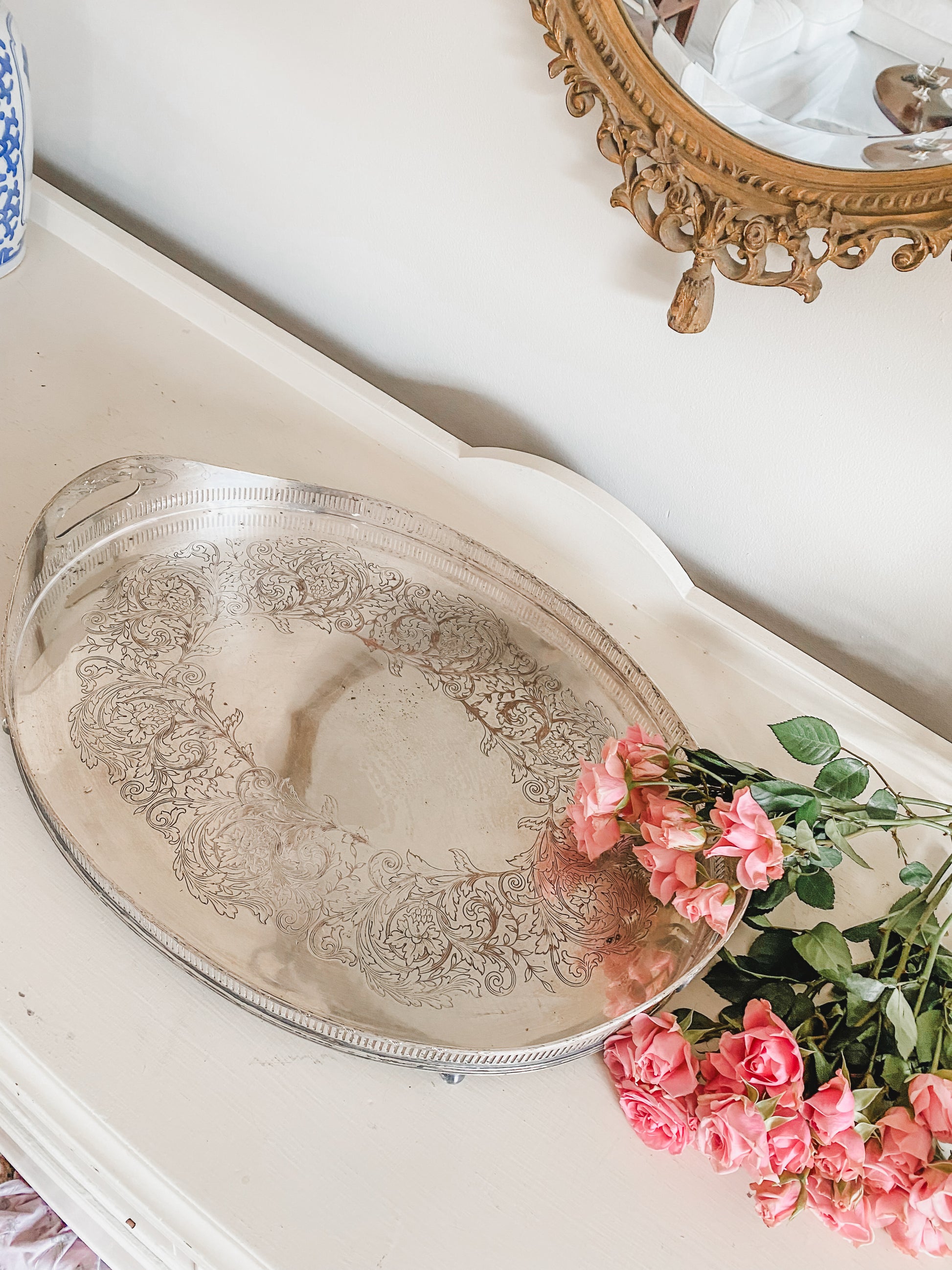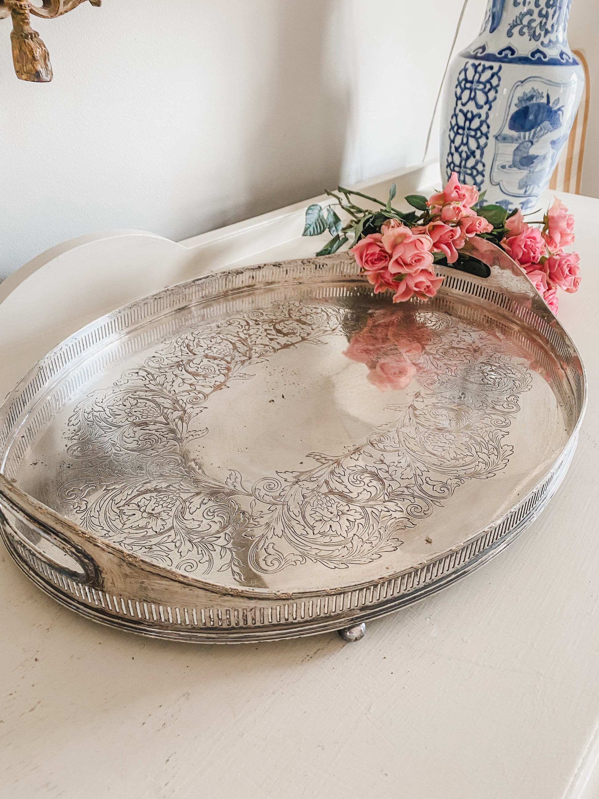 Large 1800s Antique Silverplate Gallery Tray – Footed Base, Etched Center & Ornate Rail