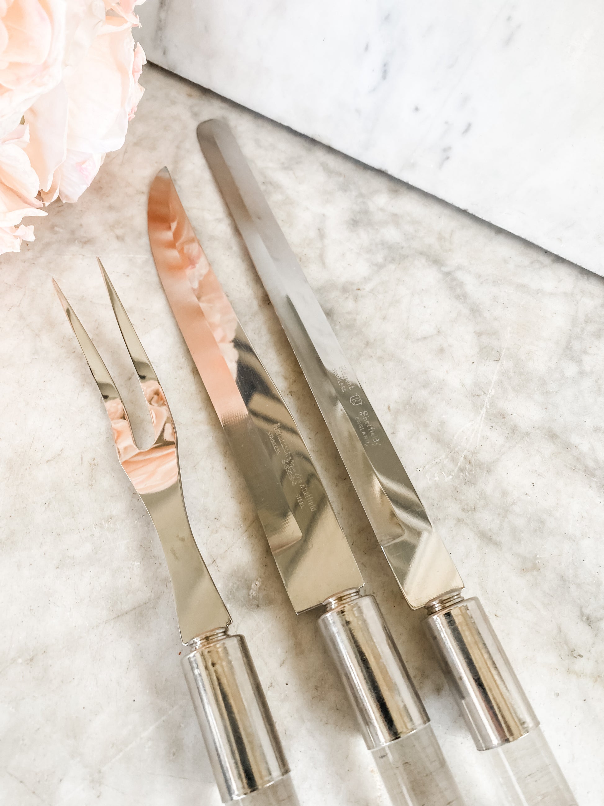 This vintage carving set by Richardson & Son is a perfect blend of classic style and practicality. The acrylic handles have a beautiful bamboo look, giving them a warm, traditional feel. The stainless steel blades are sturdy and sharp, ready for any carving job. In excellent condition overall, with just a few small marks on the handles. A fantastic set for anyone who loves a touch of grandmillennial charm at the table!