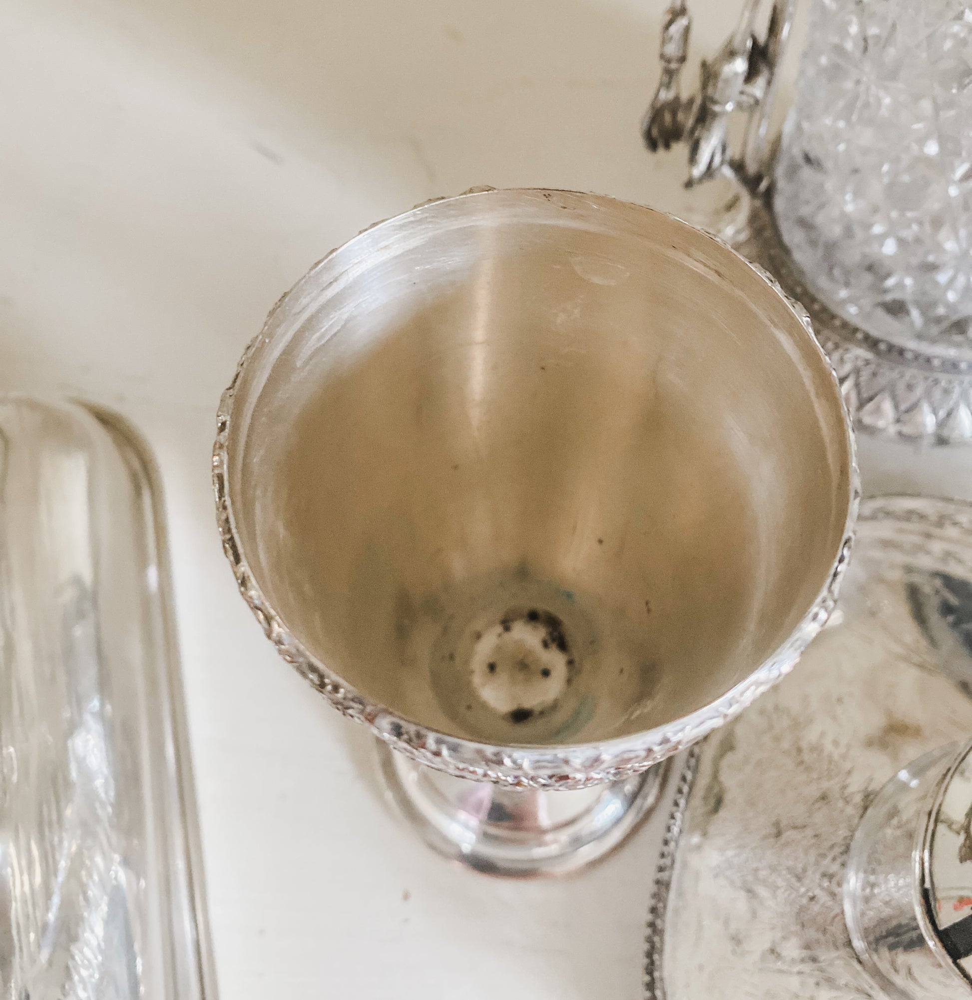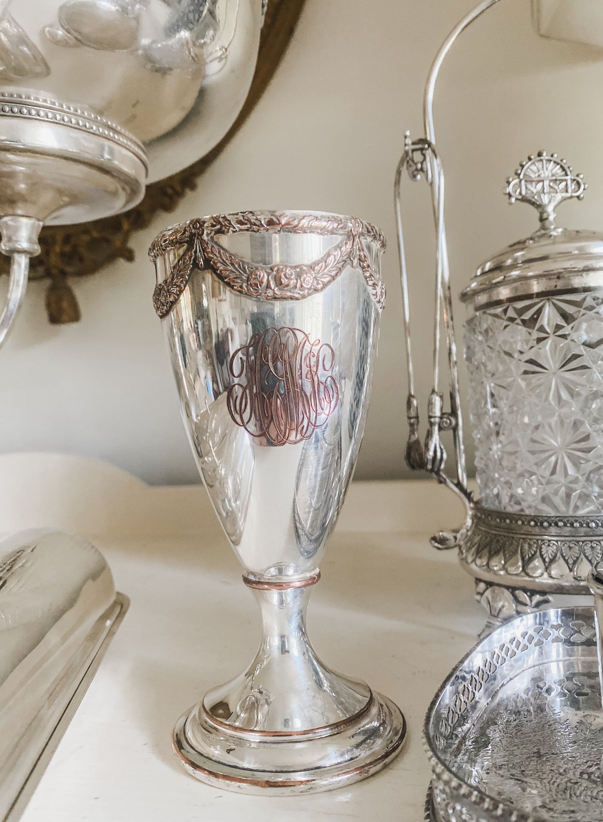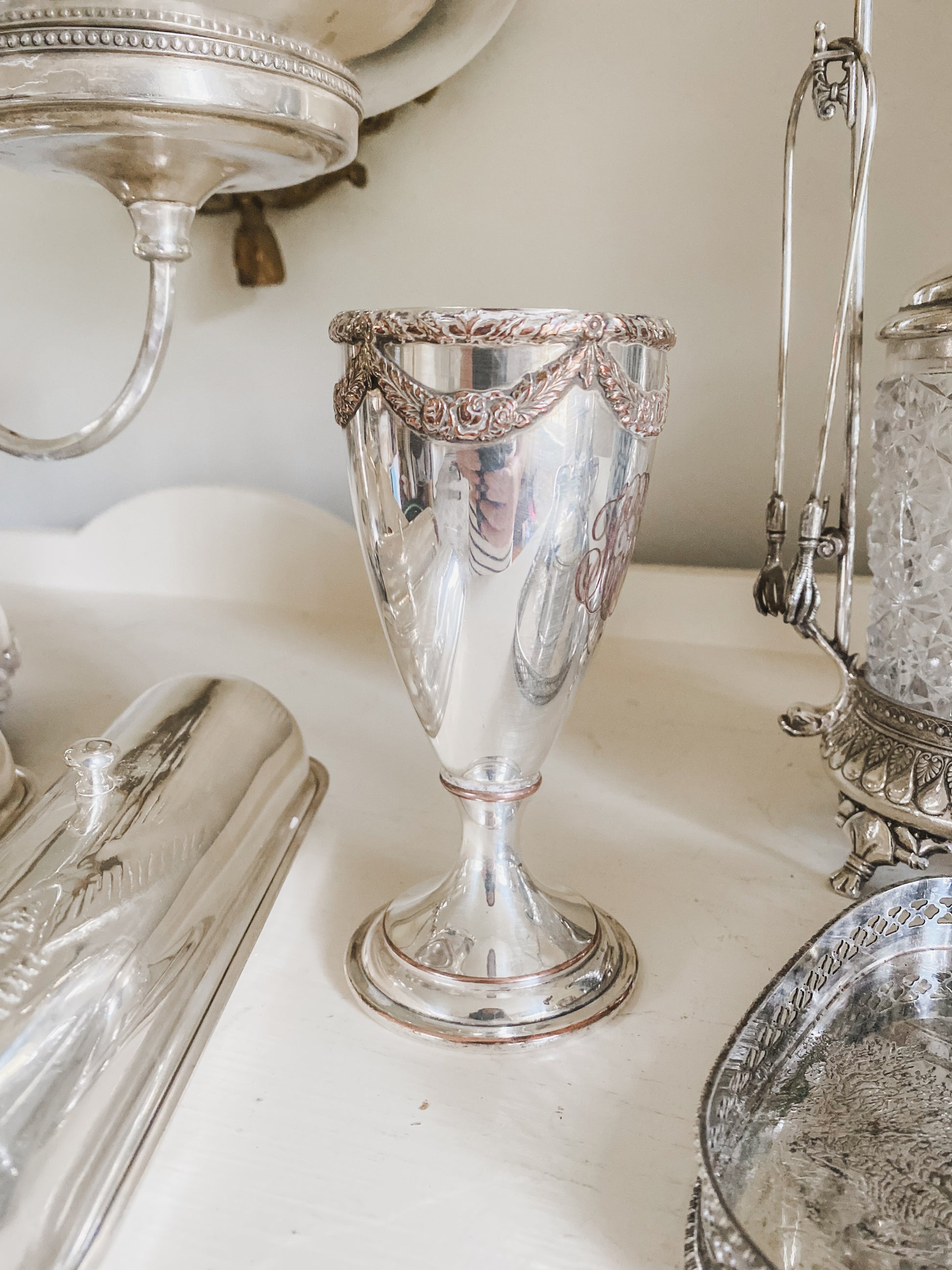 Here is a charming pedestal vase resting on a double base, featuring a floral bunting garland around the top. It bears an indistinct monogram on one side and was crafted by Henry Wilkinson and Sons in the late 1800's. This exquisite antique is in very good condition, with a hint of copper showing through, enhancing its lovely patina.