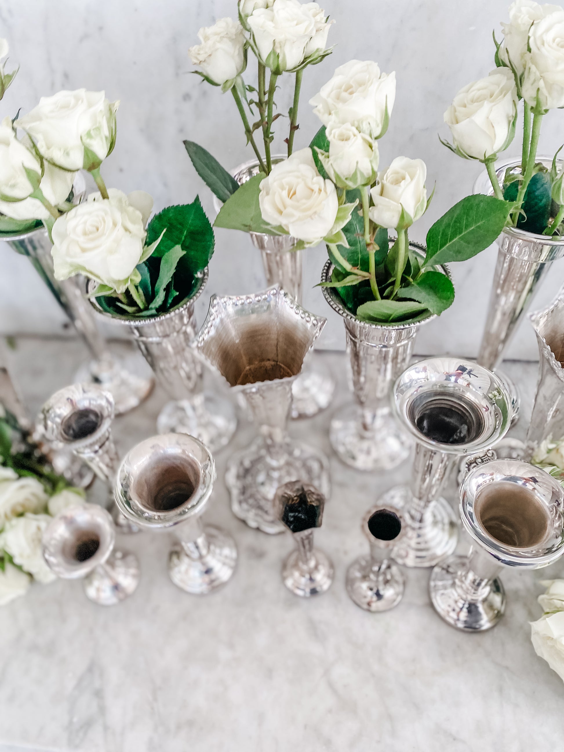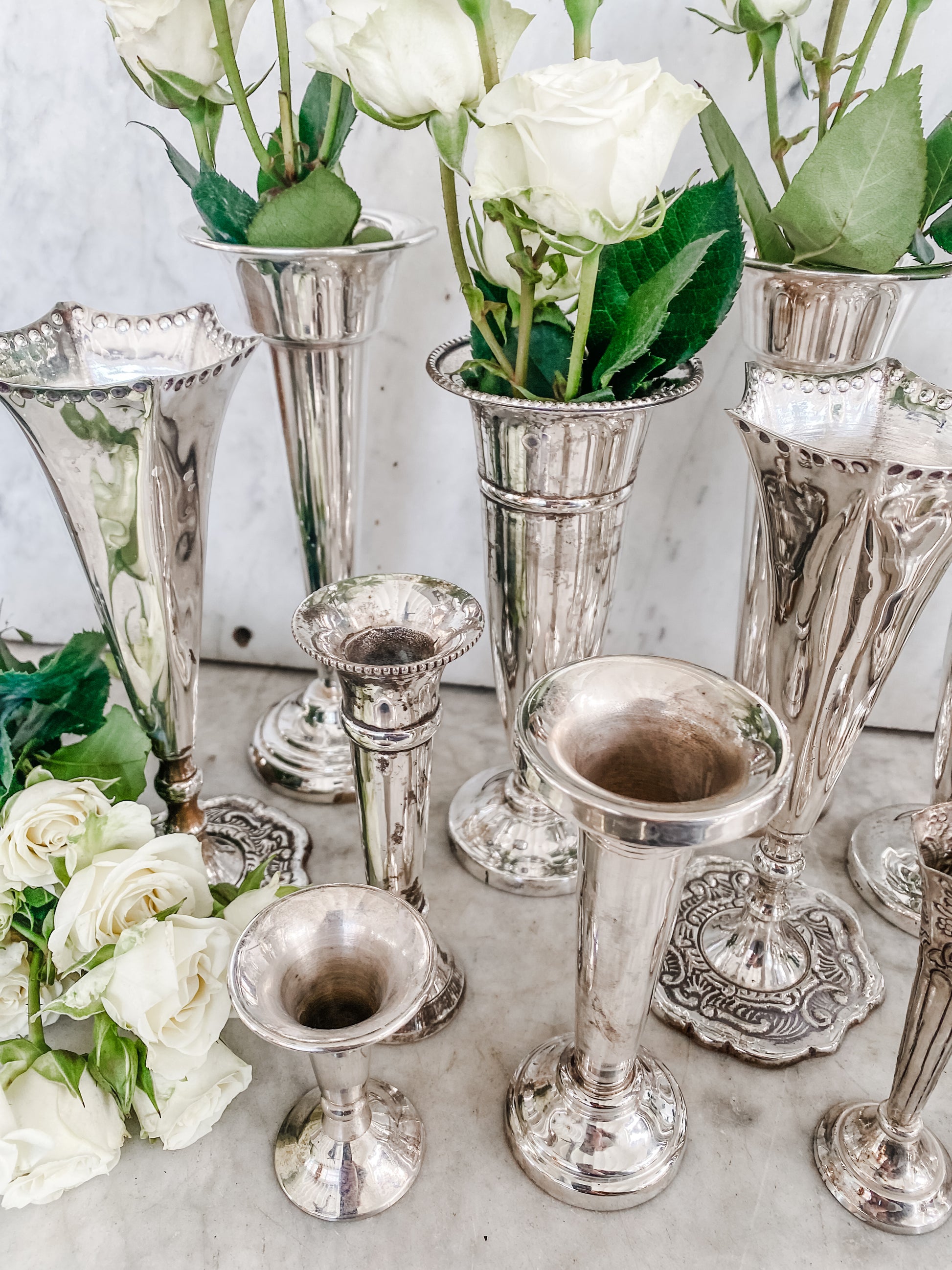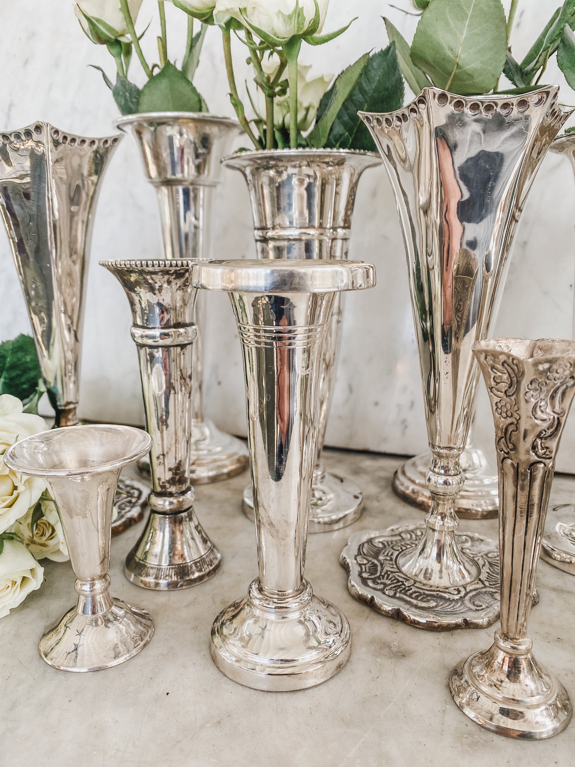Fabulous! A truly stunning set! This collection includes 15 silverplated trumpet vases in various sizes, perfect for creating a breathtaking display. Whether you're planning a wedding, baby shower, bridal shower, or simply want a showstopping centerpiece for your dining table or mantel, these vases will make an unforgettable statement.