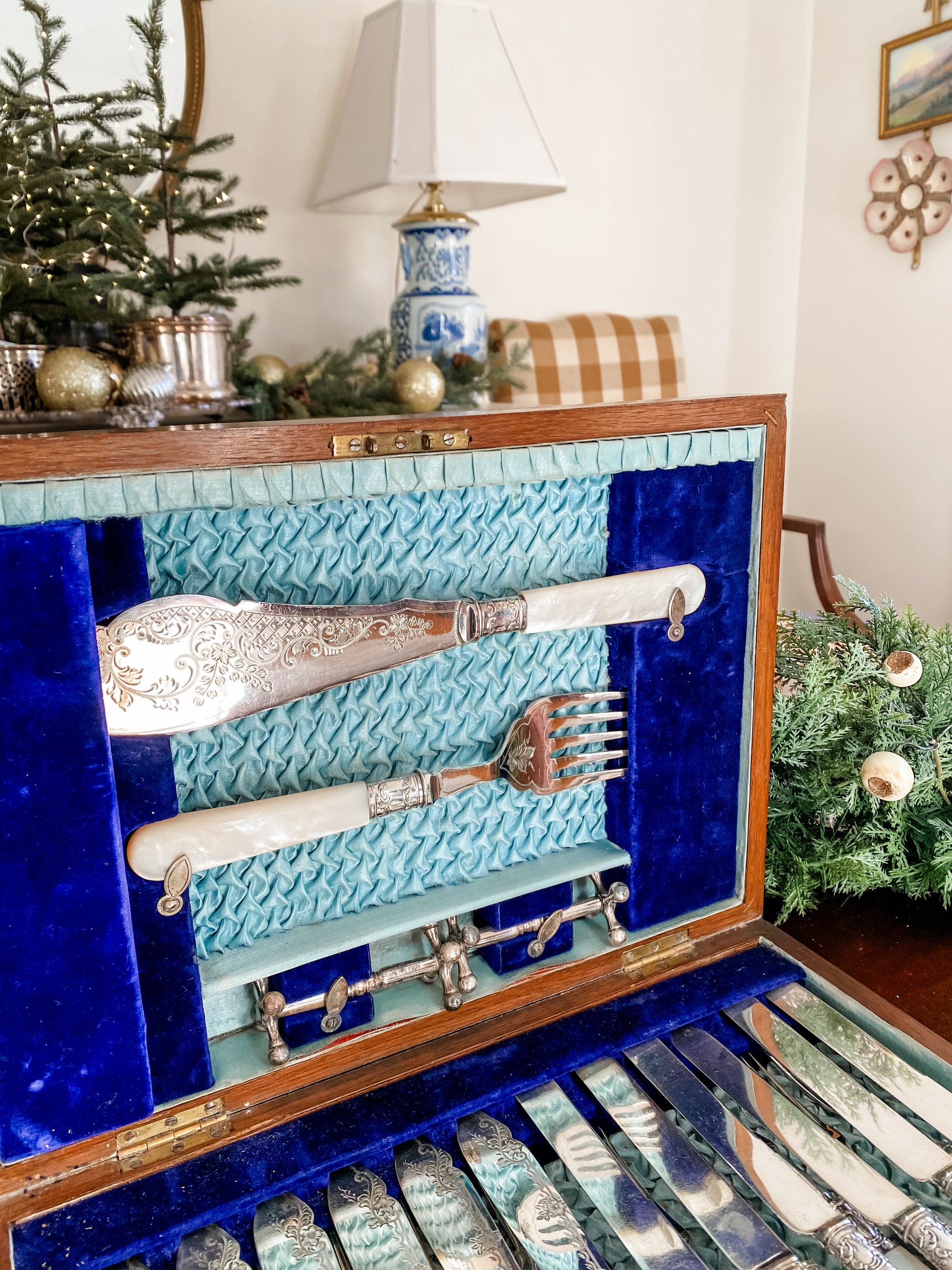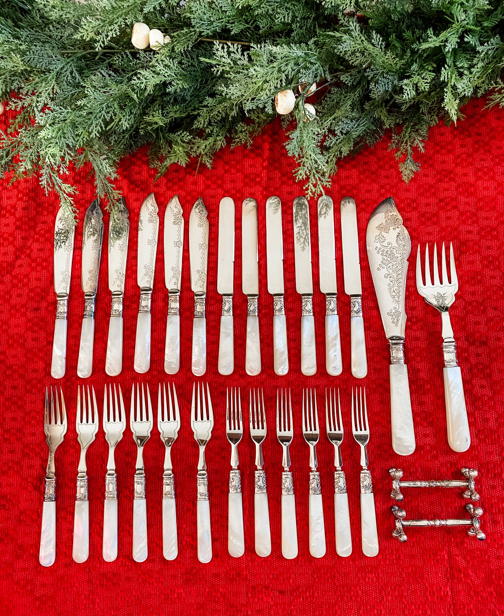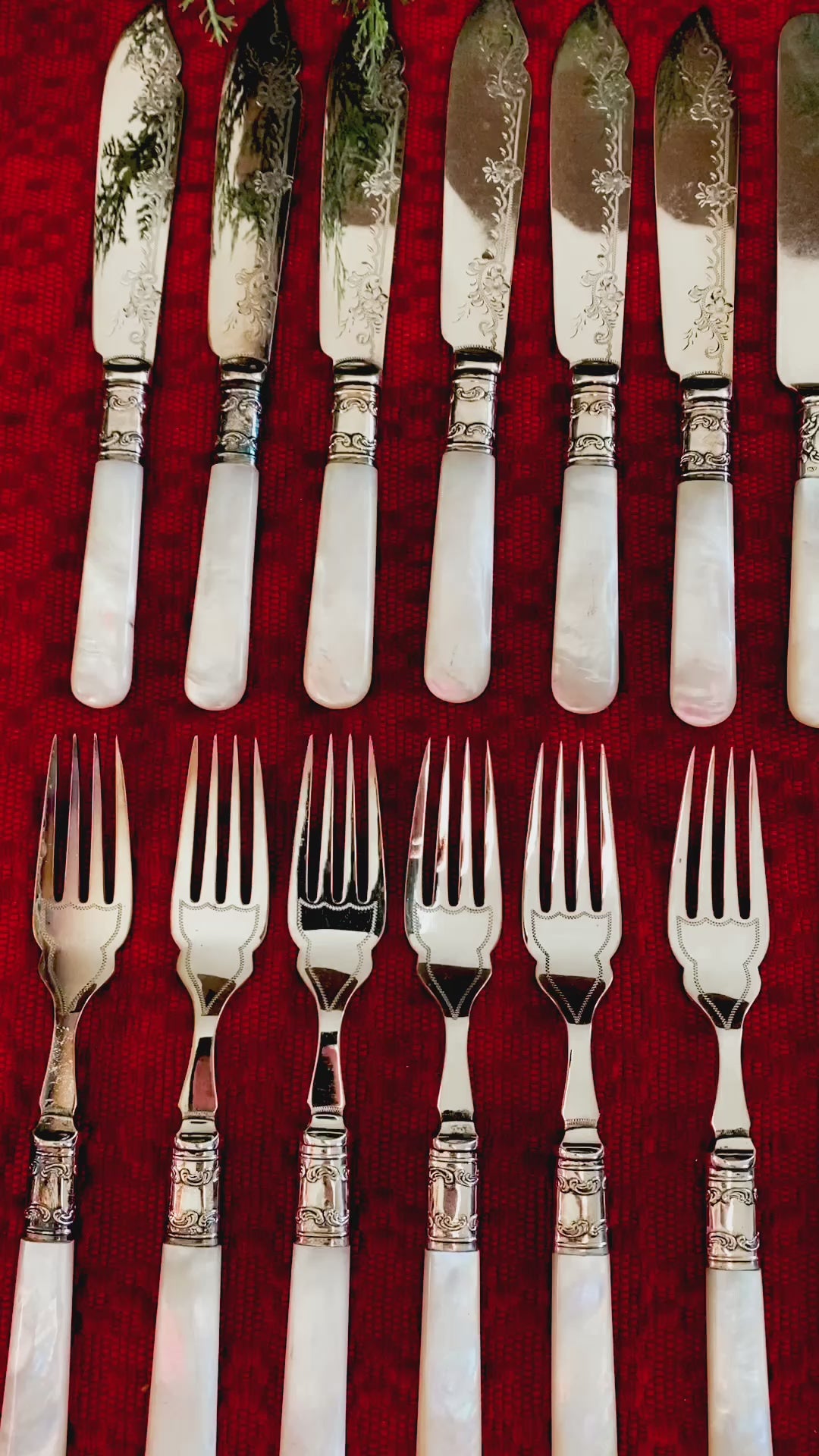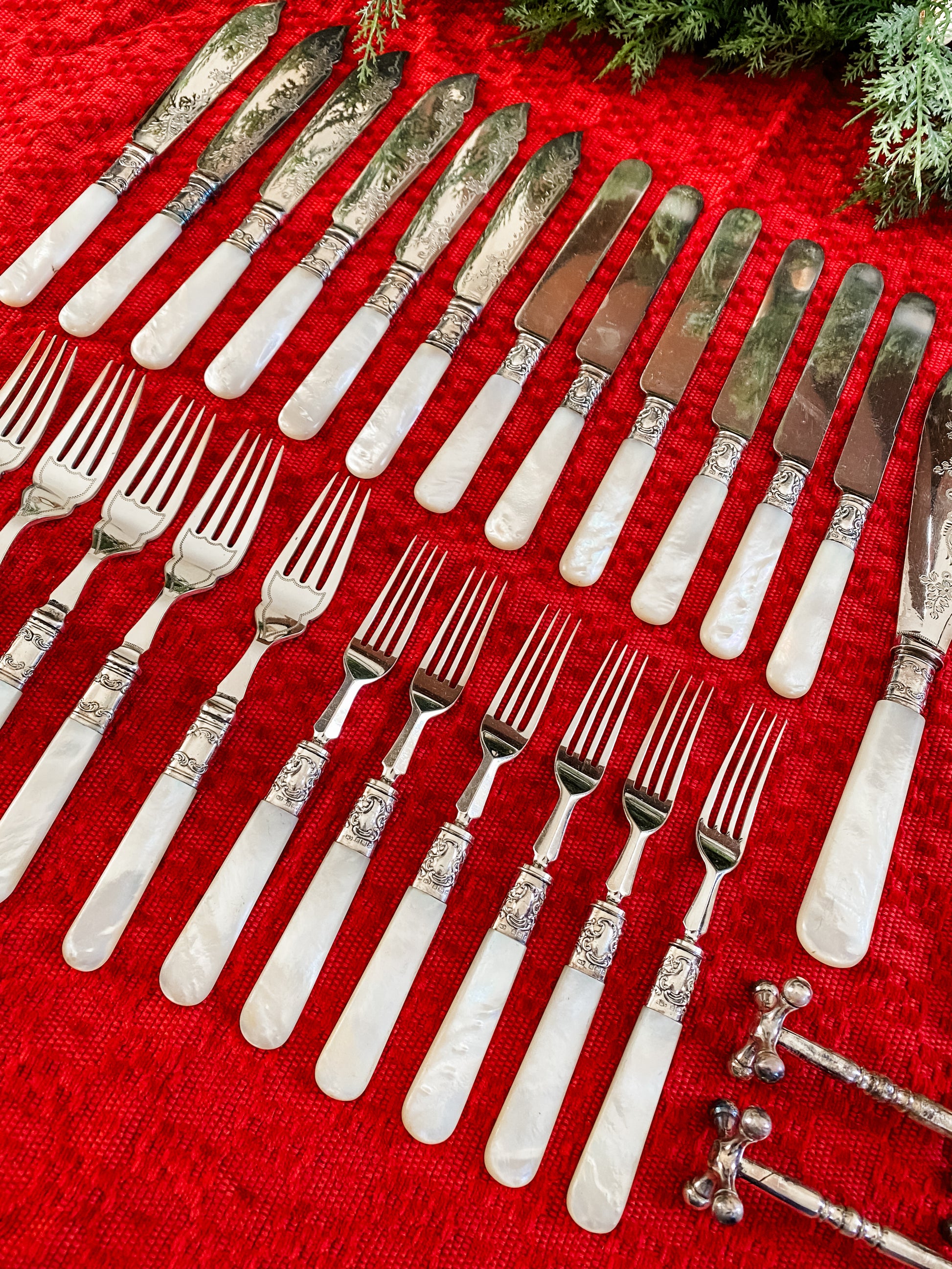 Fabulous! This is a fantastic set of 26 antique mother of pearl handled pieces - a set of 12 knives, 12 forks, large serving fork and knife plus two utensil rests. These forks are EXTREMELY rare and very very difficult to find. I do not know when I will come across a matching set like this again. The etching on these is so special and really set these apart. Originally intended for serving fish, use these to serve your Christmas eve fish or anything else you desire! They are silver plate with sterling silver collars and antique mother of pearl handles. A great price, sets like this one are priced in the thousands on other sites. They are stored in an antique oak box beautifully lined in teal silk. Made in England