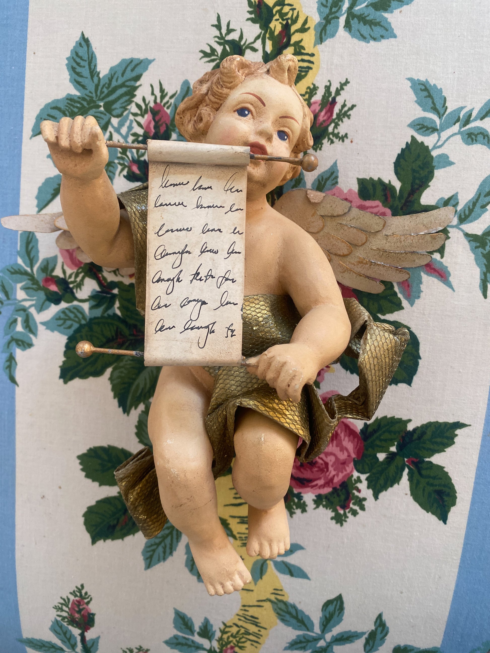 Hand-painted putto figure holding a scroll. This piece measures approximately 8.5 inches long and features metal wings, gold fabric details, and a beautifully hand painted face. The expression on these is especially nice.