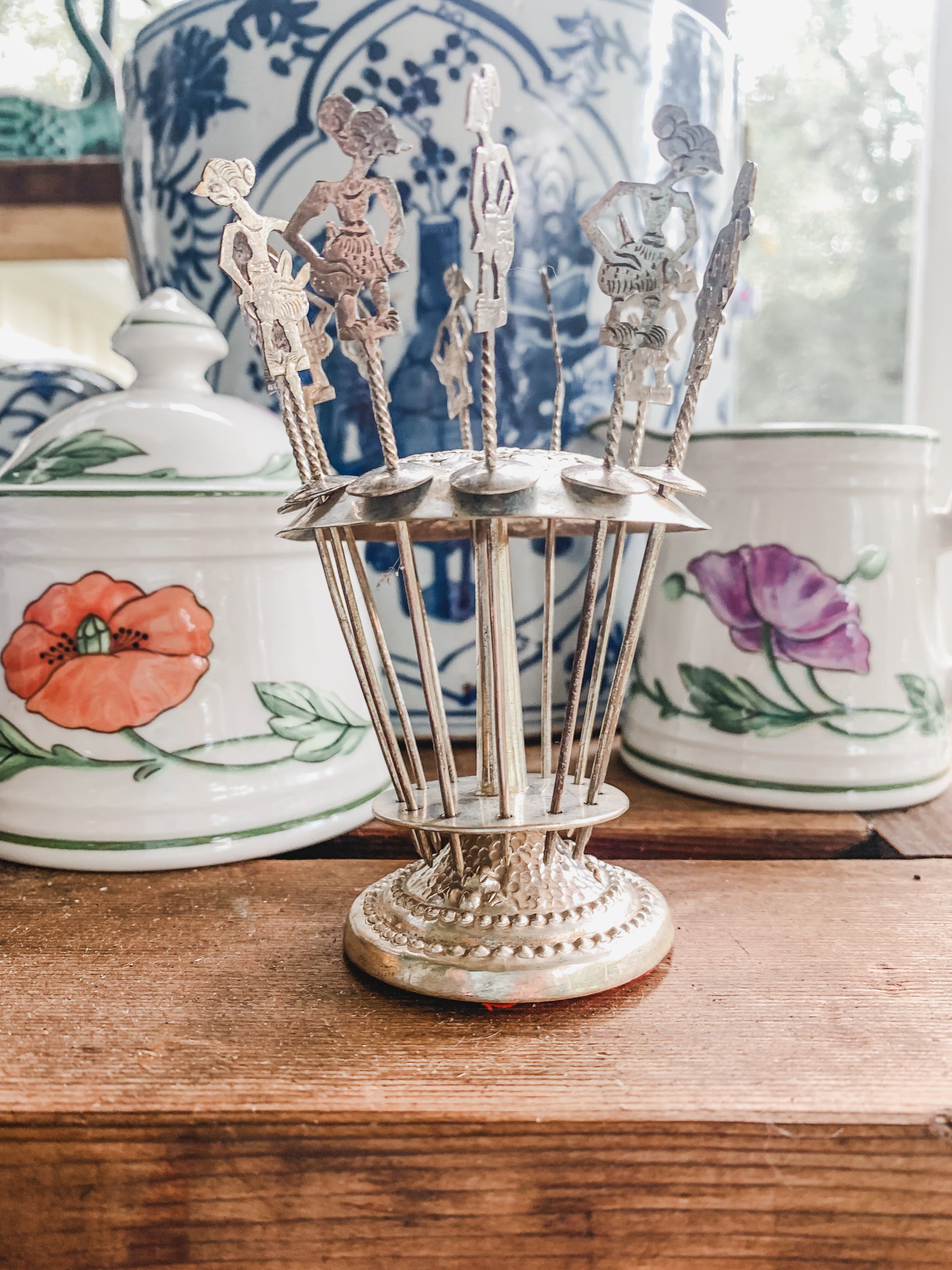 Here is something I bet you don't have! Silver toothpicks in a toothpick holder! Now wouldn't this look neat in your next bar setup? They are 4" tall and some type of silver-colored metal. I'm not sure what type. Vintage.